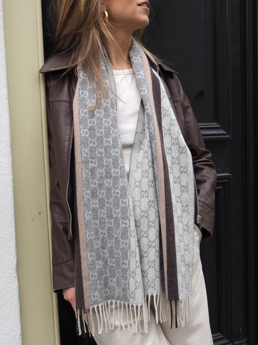 GUCCI GG JACQUARD CASHMERE/WOOL SCARF WITH TASSELS