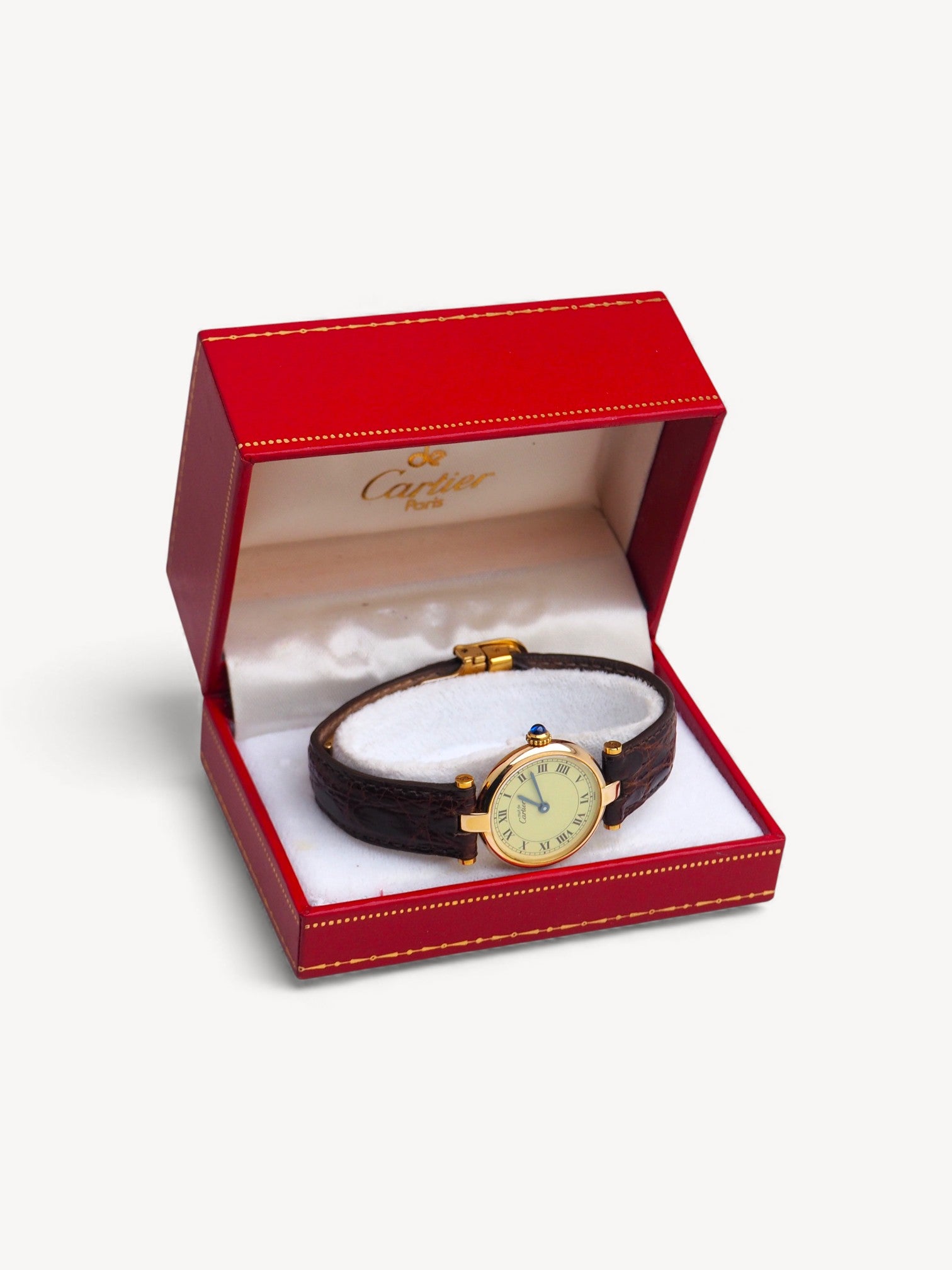 1990s Cartier Vendôme watch featuring a classic round vermeil case and a brown alligator leather strap. The blued steel sword-shaped hands and cabochon crown are signature Cartier details. The dial has a minor scratch. Please refer to the images for a detailed view of the item.