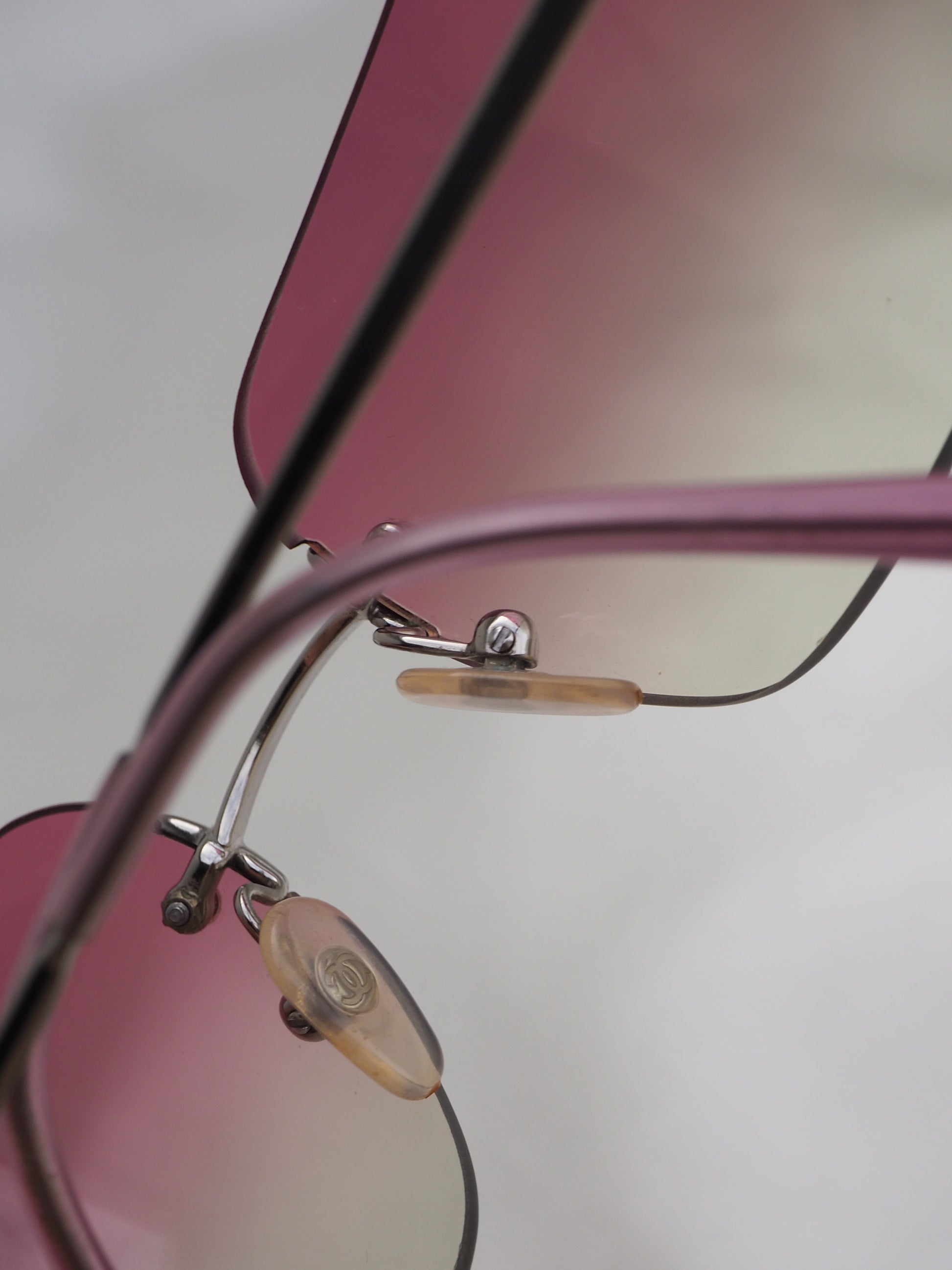 Chanel 4017-D sunglasses featuring pink gradient rimless lenses and signature CC logos adorned with rhinestones on both sides. The stones are intact and sparkling. Light hairline scratches on the lenses. Please refer to the images for a detailed view of the item.