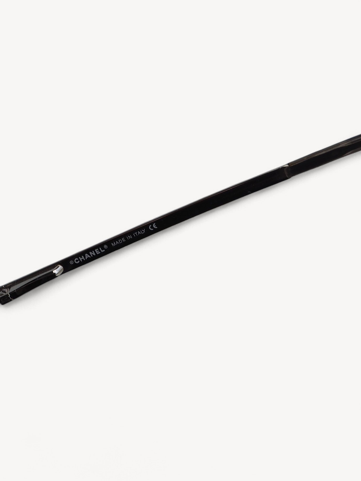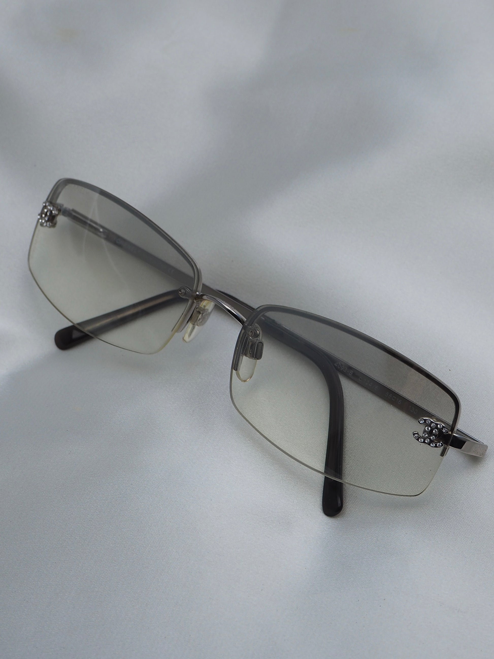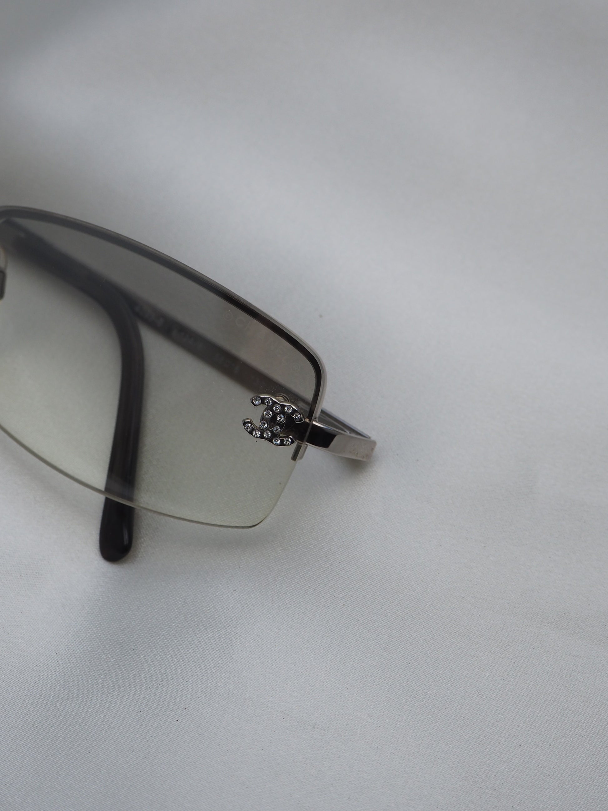 These vintage Chanel 4093-B sunglasses feature clear gradient lenses, silver details and the iconic rhinestone CC logos on both sides. The lenses, nose pads, and stones are in very good condition. Only some minor spots on the left lens. Please refer to the images for a detailed view of the item.