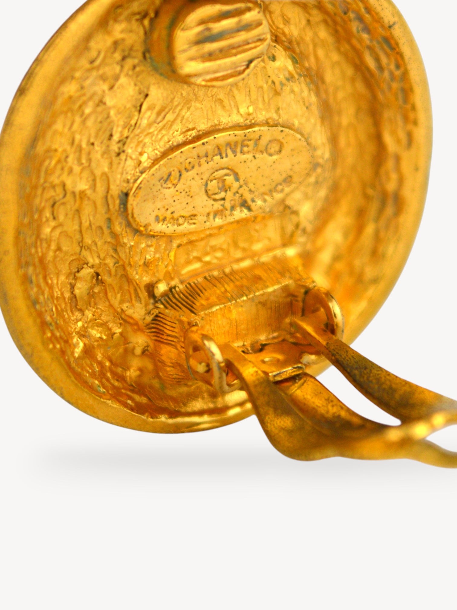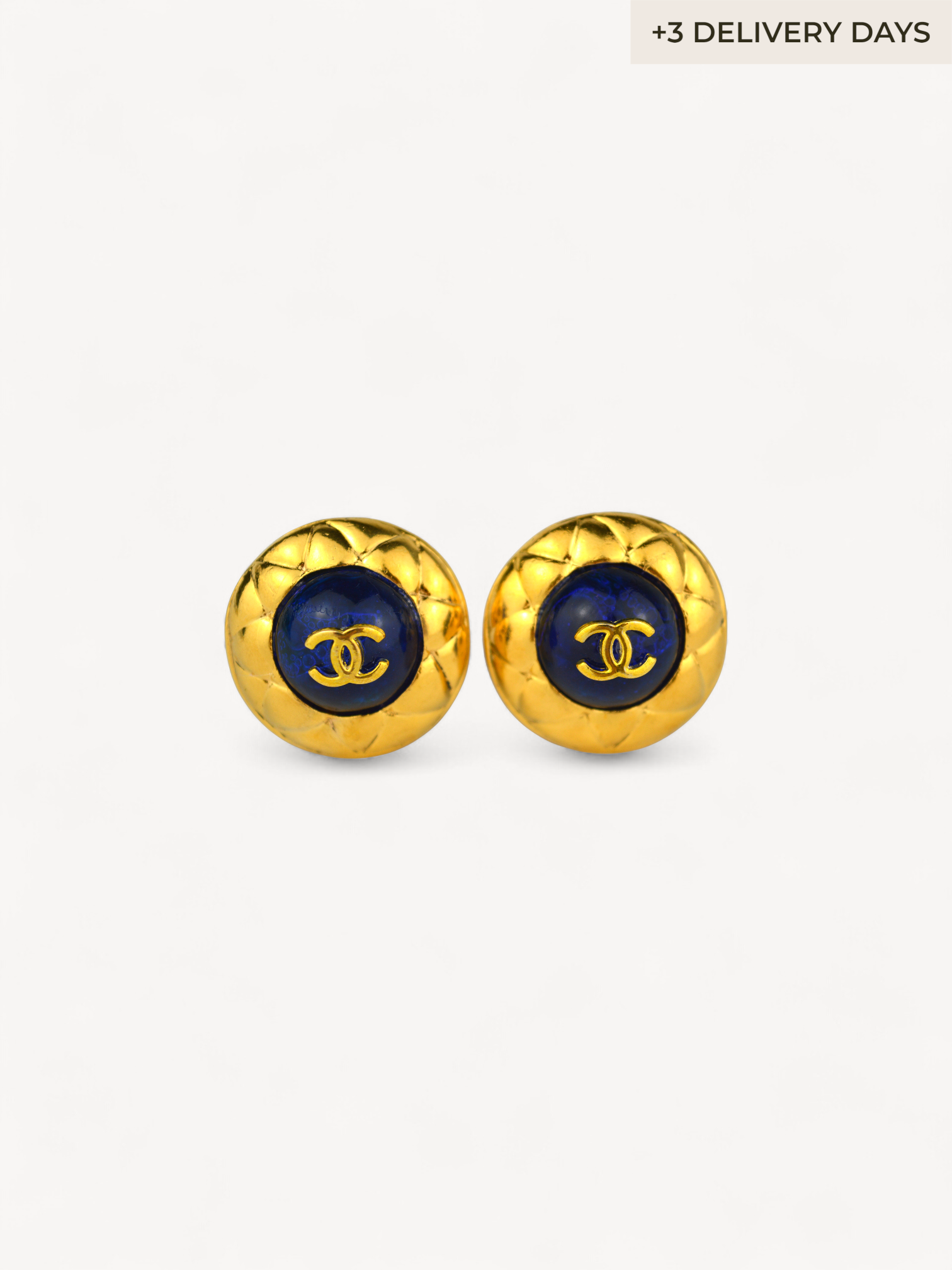 These 24k gold-plated vintage Chanel earrings feature a round design with a deep cobalt blue resin center and the iconic interlocking CC logo. Designed with a comfortable clip-on fastening, perfect for both pierced and non-pierced ears. In good vintage condition, please refer to the images.