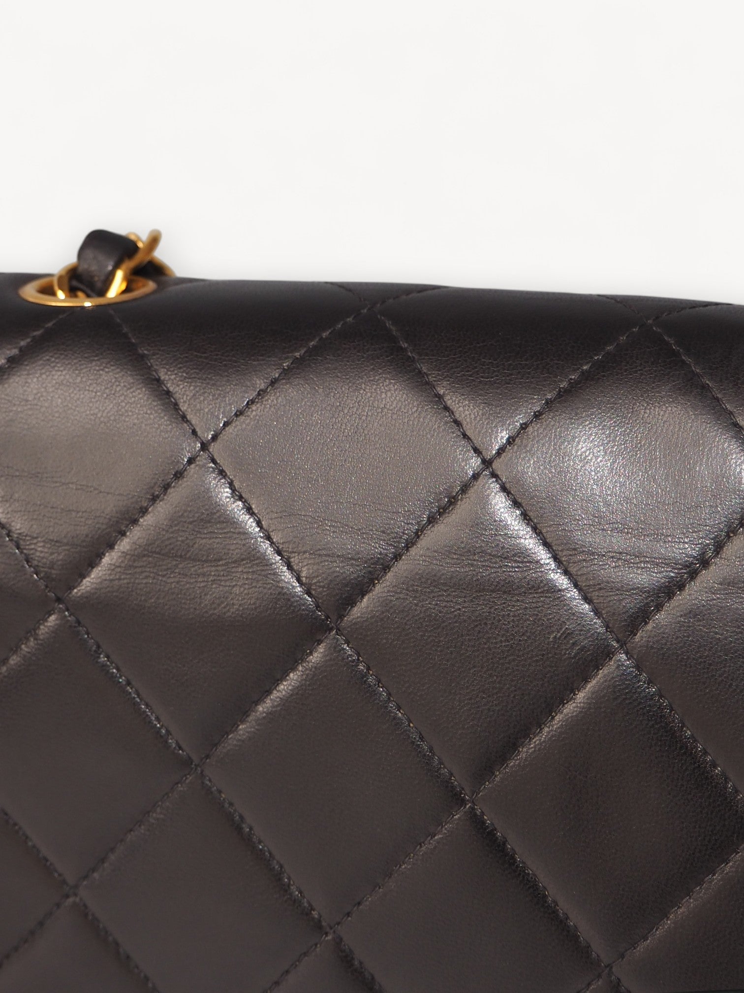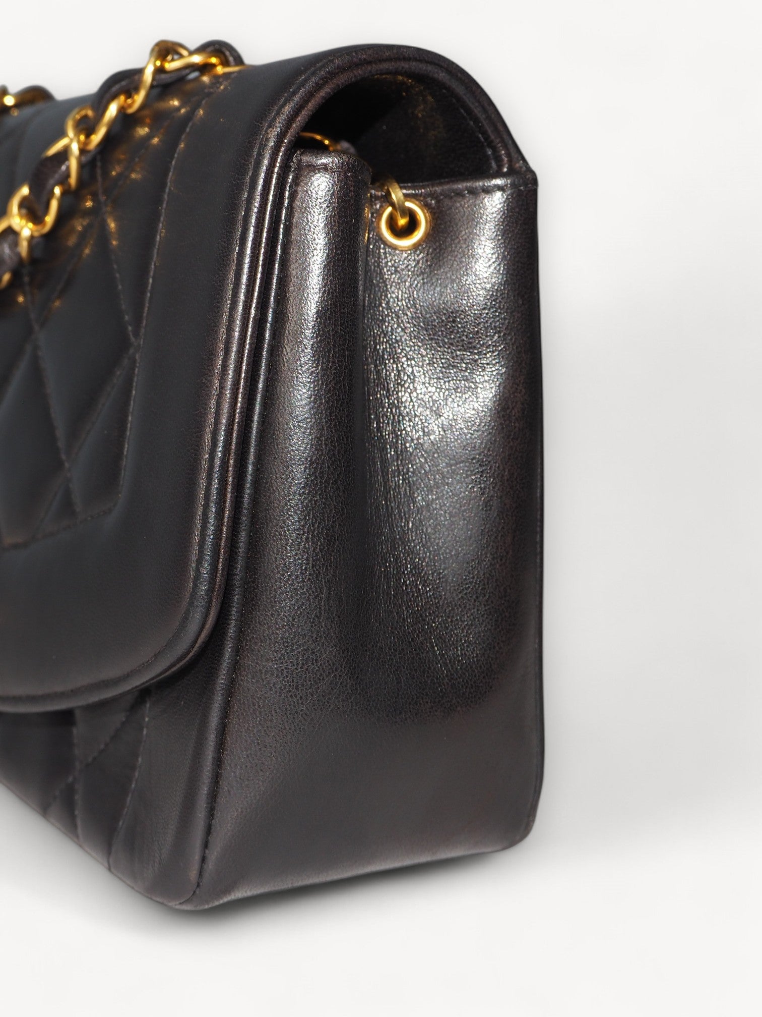 This Chanel Diana Shoulder Bag is crafted from supple black lambskin leather and finished with 24k gold-plated hardware. What sets this particular Diana apart is its black lambskin interior; a rare variation, as most classic Chanel bags feature burgundy lining. The iconic CC turnlock opens to a spacious interior with a zipper pocket and a hanging pocket for small essentials. Designed with an interwoven leather chain strap, it can be worn gracefully over the shoulder or styled crossbody. The bag is in very good condition and the sticker is intact. Please refer to the images for a detailed view.
