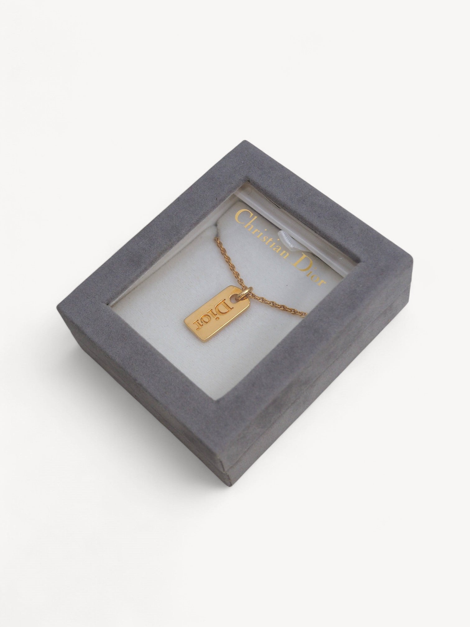 This Dior necklace features a name tag pendant engraved with the iconic 'Dior' logo, suspended on a twisted chain with adjustable length and secured with a lobster clasp. Crafted from high-quality gold-plated stainless steel, it has maintained its color and shine for over 20 years. Please refer to the images for a detailed view of the item.