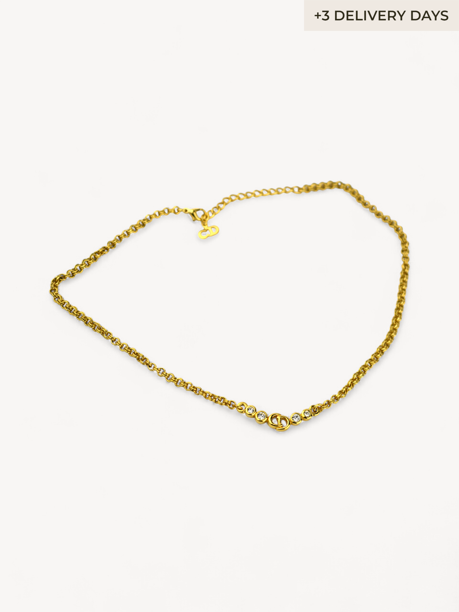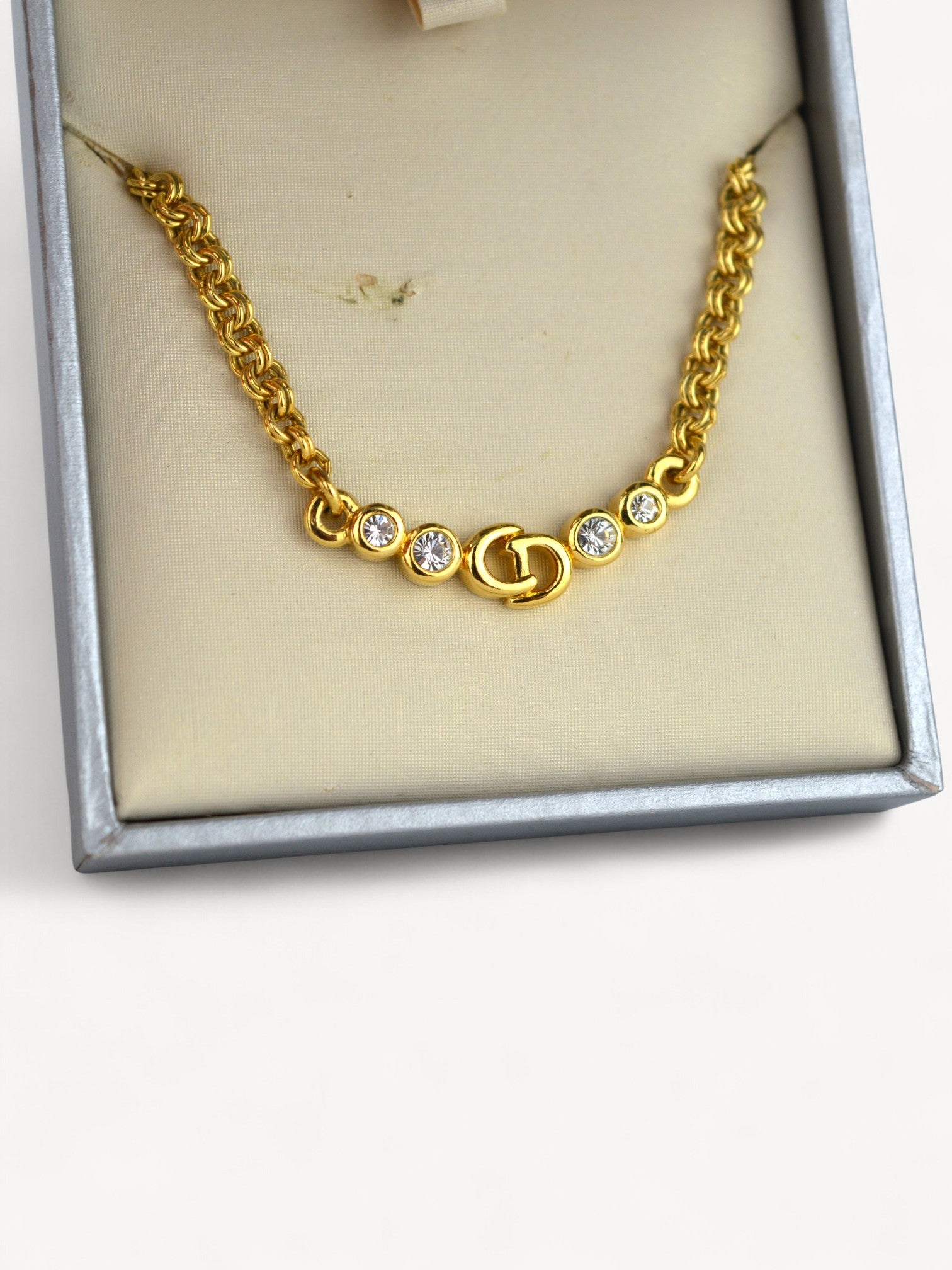 This vintage Dior necklace features the iconic 'CD' logo accented with four rhinestones, suspended on a chain with adjustable length, making it versatile for layering or wearing on its own. Crafted from high-quality gold-plated stainless steel, it has maintained its color and shine for over 20 years. Please refer to the images for a detailed view of the item.
