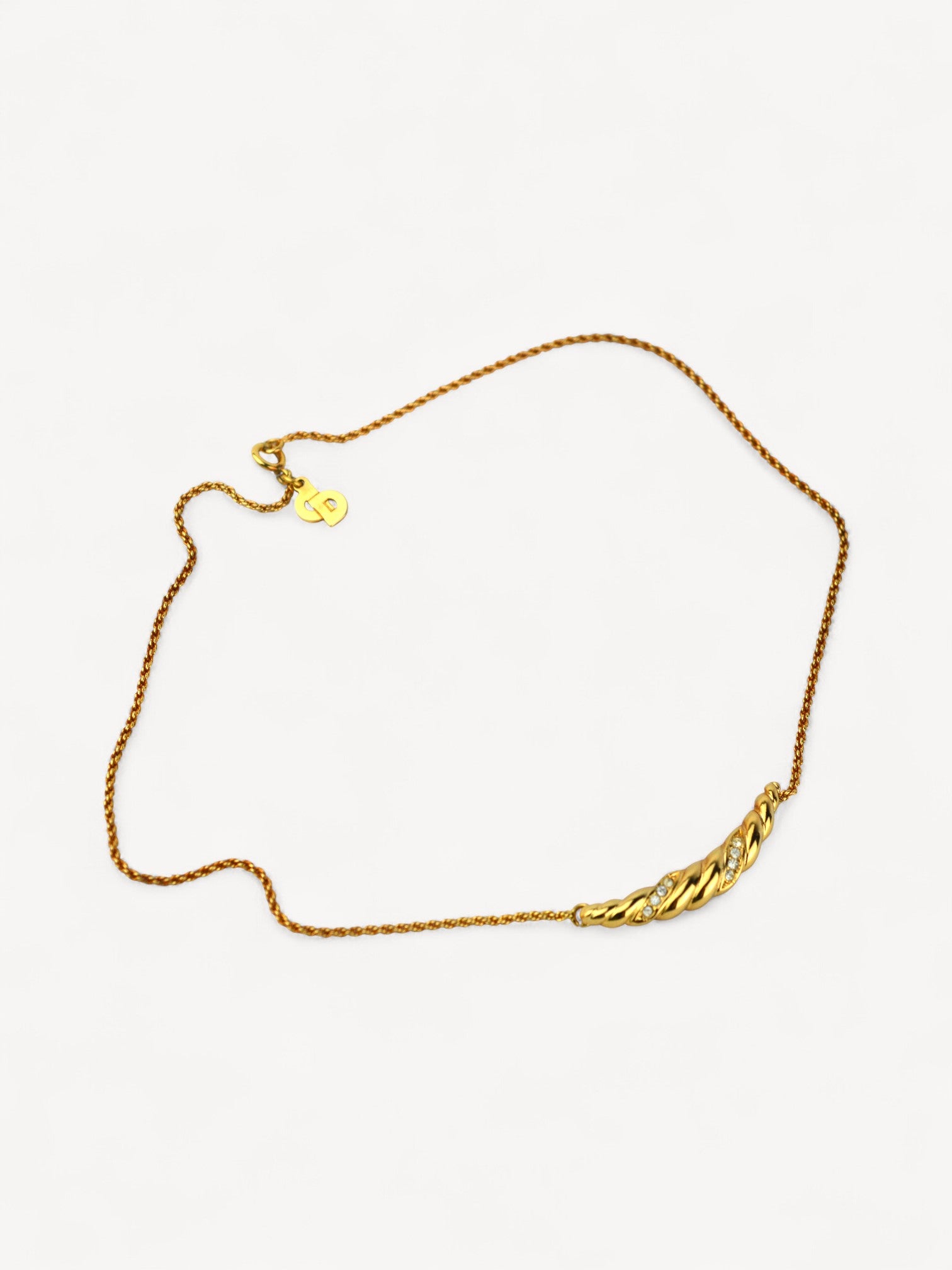 This 1980s Christian Dior necklace features a rope chain with a rhinestone-embellished twisted bar pendant. Crafted from high-quality gold-plated stainless steel. Slight discoloration on the chain. Please refer to the images for a detailed view of the item.