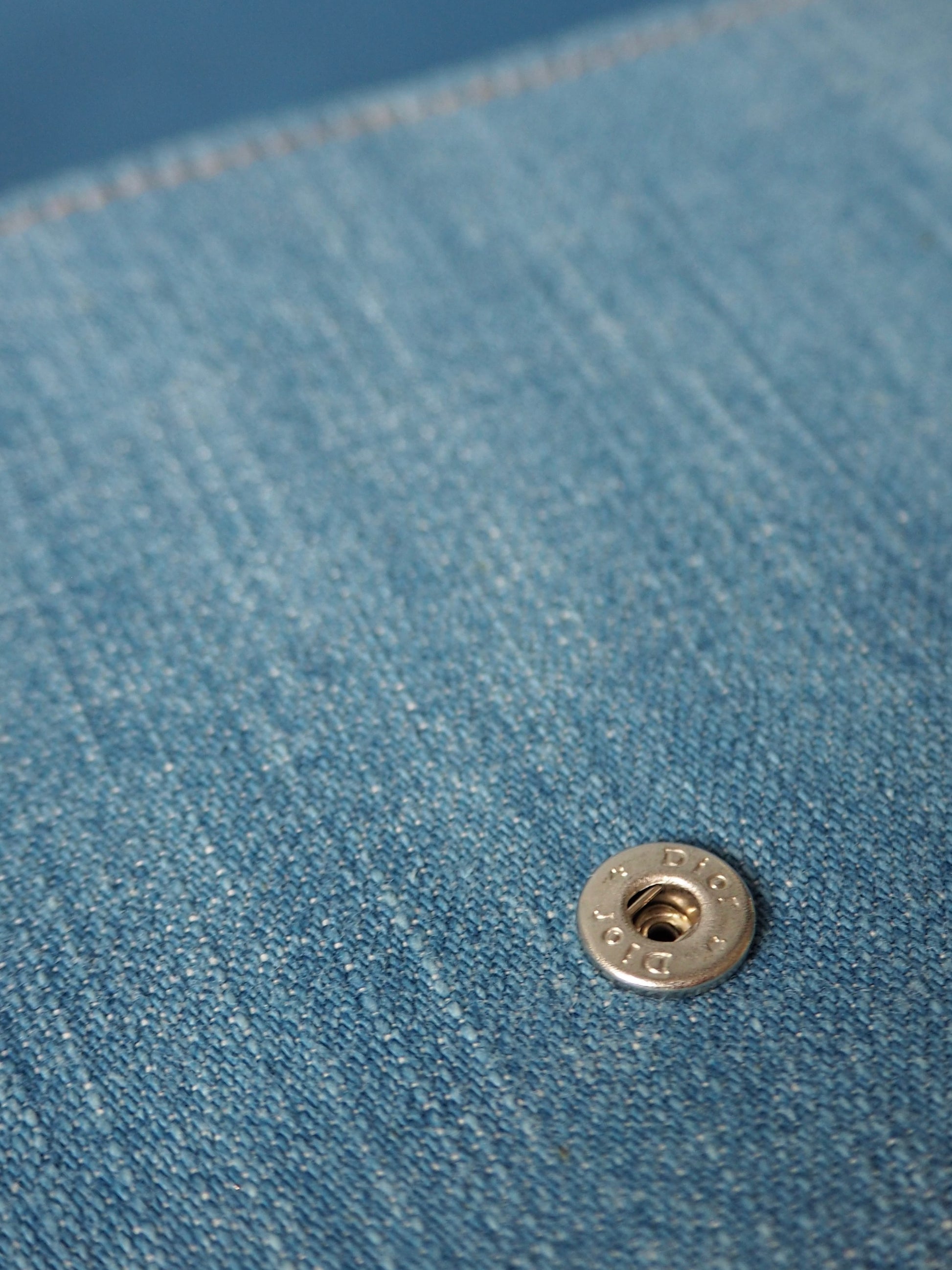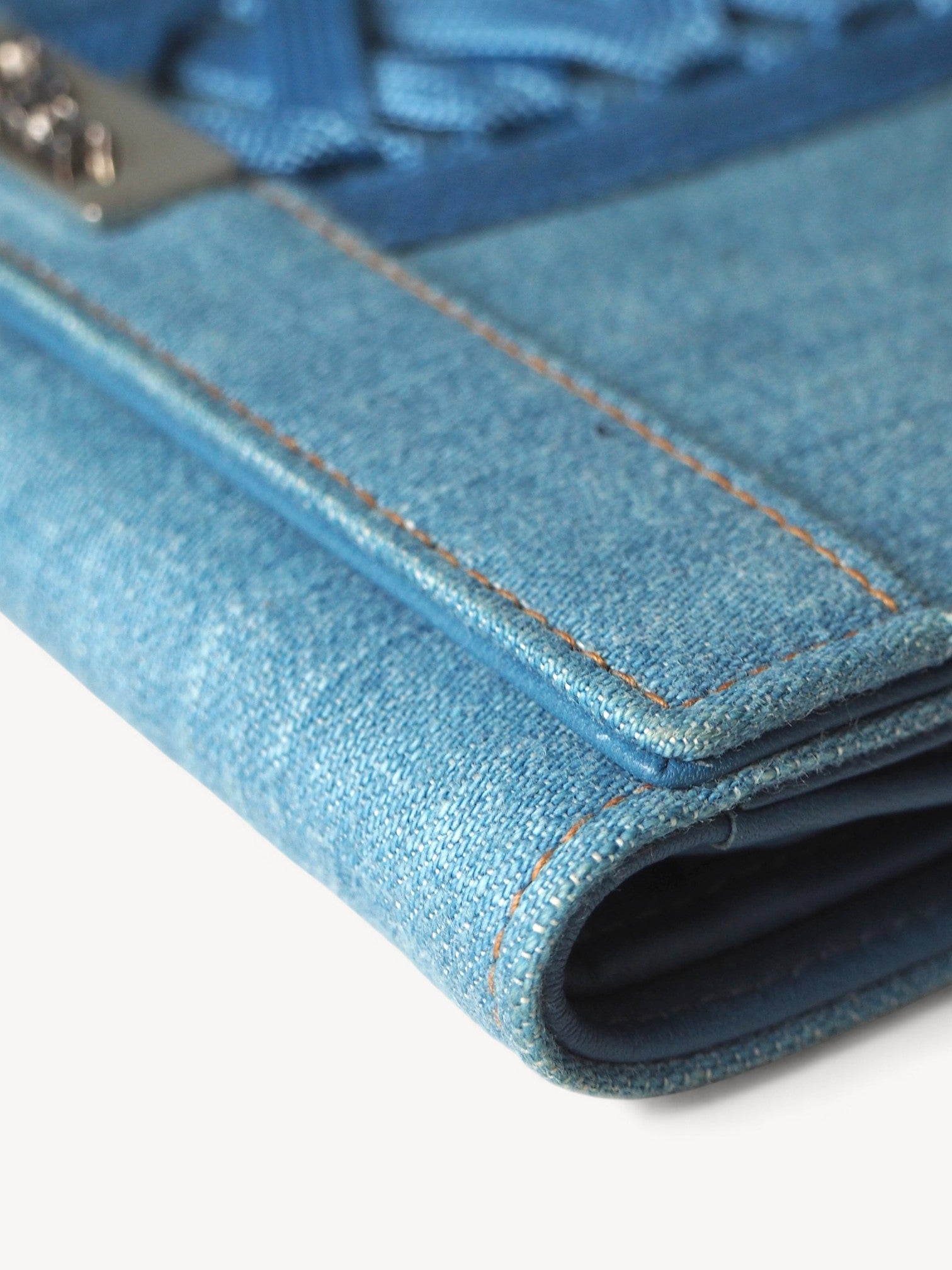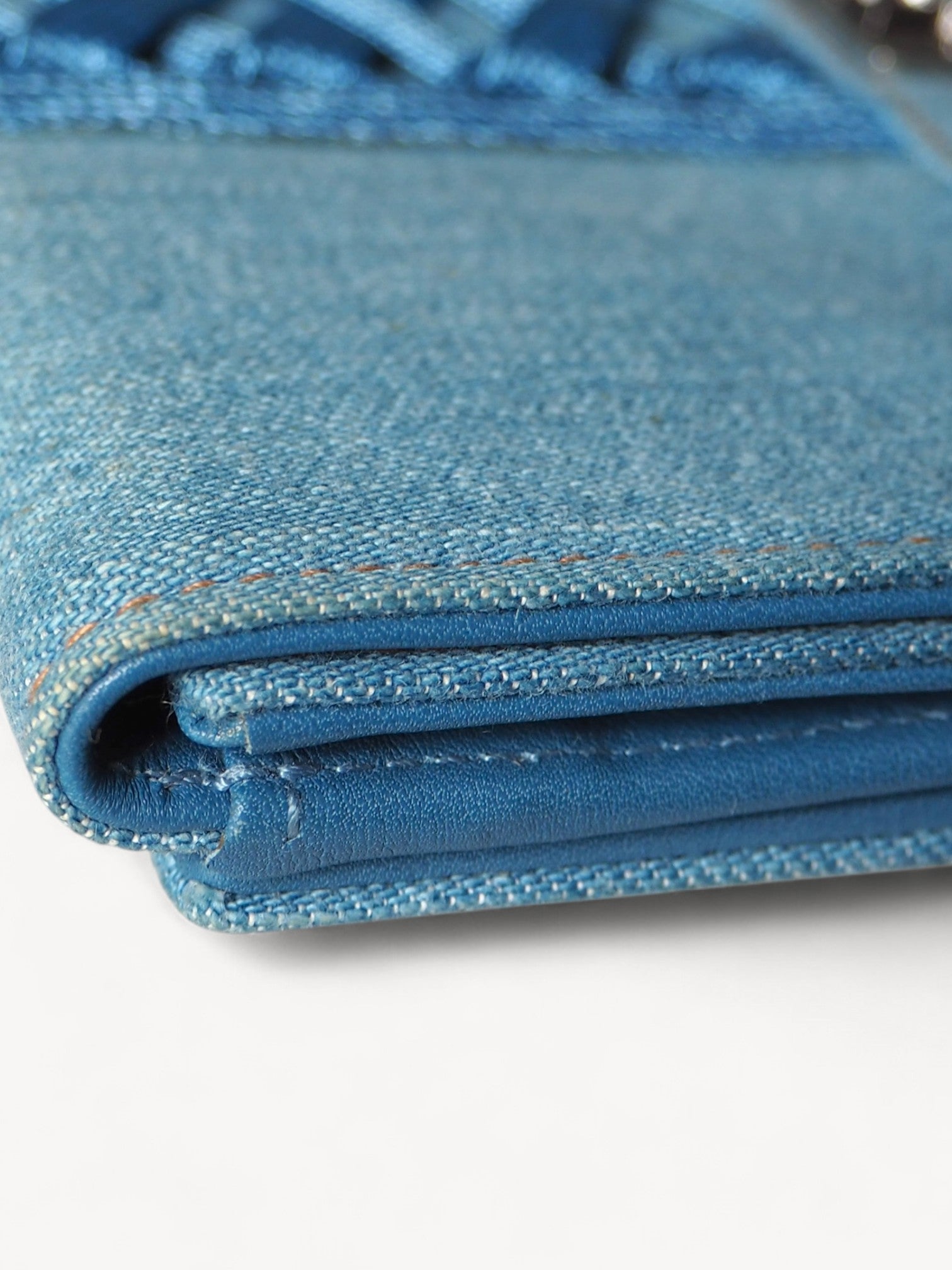 Christian Dior Admit It long wallet in light blue denim with corset-style ribbon detail at the front. Accented with silver-tone Dior logo hardware. The interior is crafted in smooth blue leather and offers extensive organization with multiple card slots, bill compartments, and an additional front compartment lined in Dior-logo nylon fabric. Please refer to the images for a detailed view of the item.
