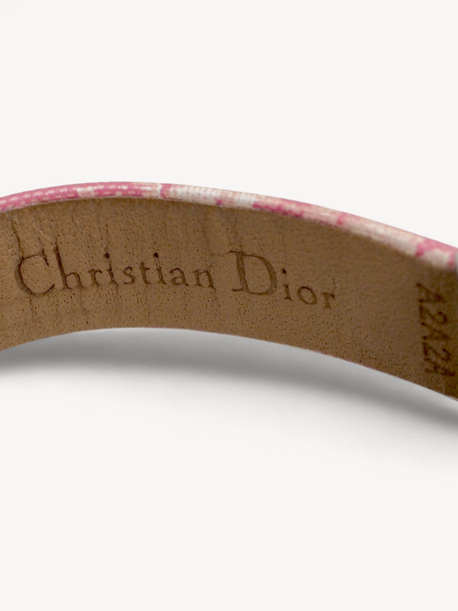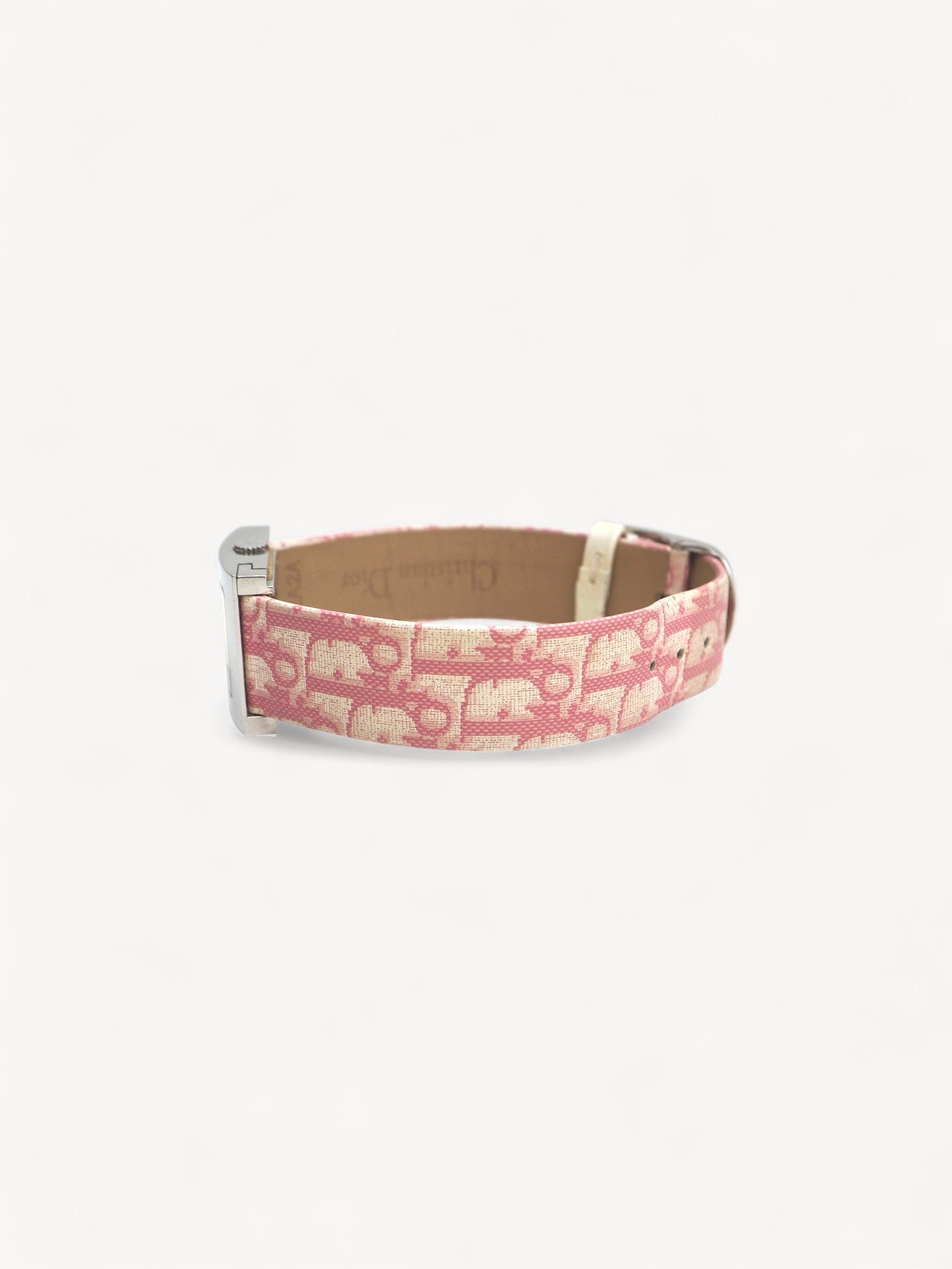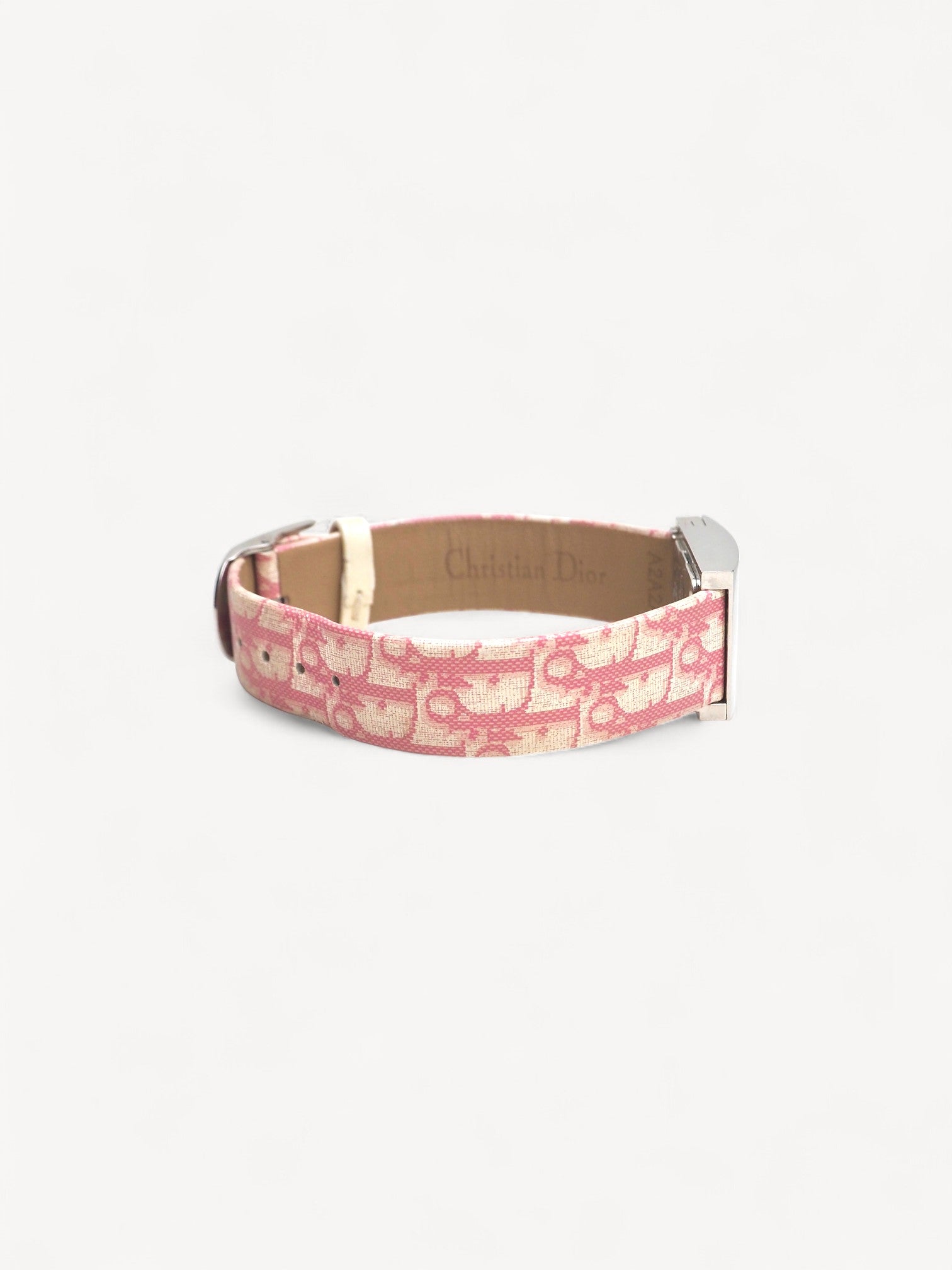 This early 2000s Christian Dior Malice watch features a pink oblique calfskin strap, mother of pearl dial, stainless steel case, and stainless steel D-buckle. Please refer to the images for a detailed view of the item.