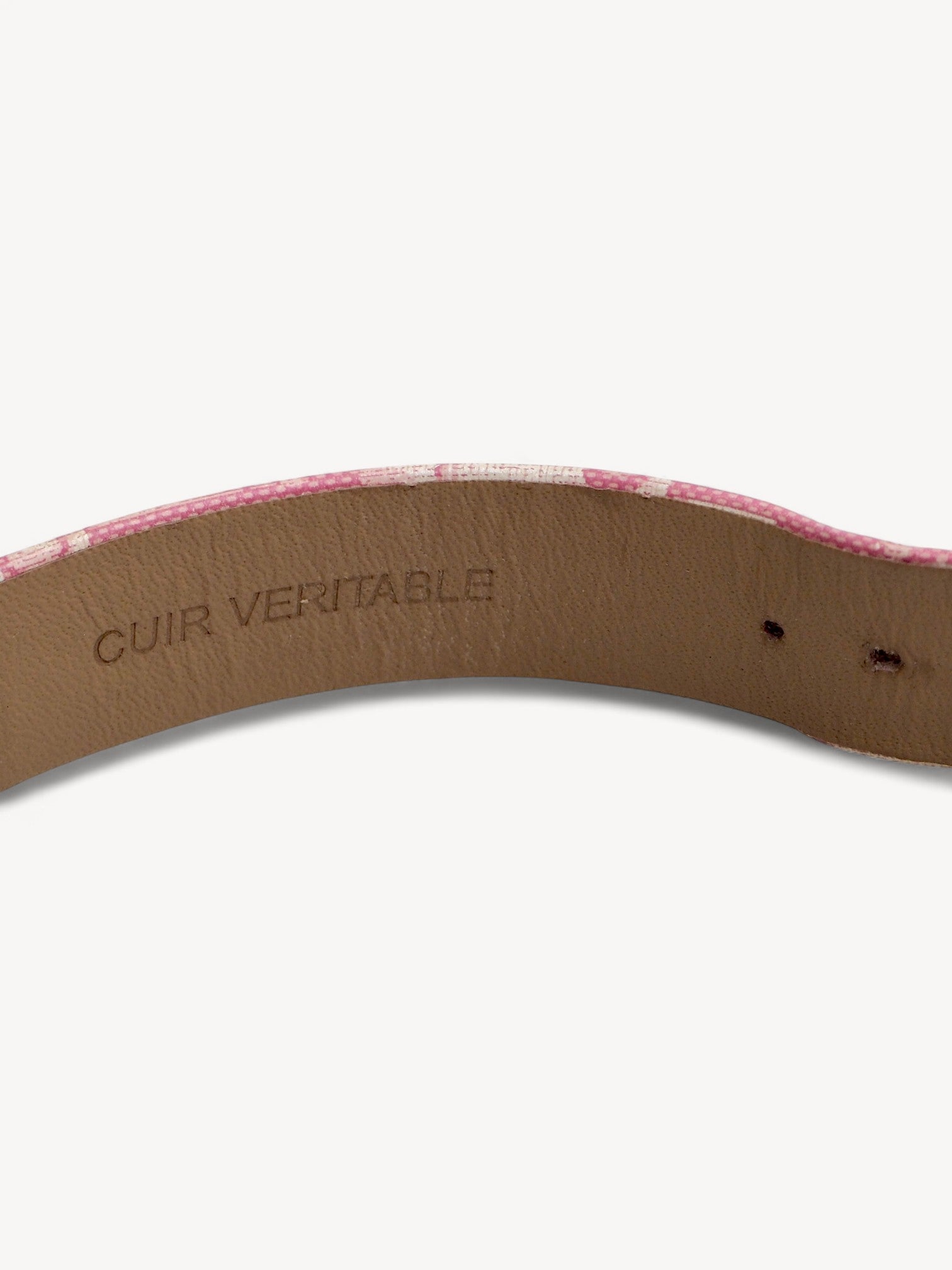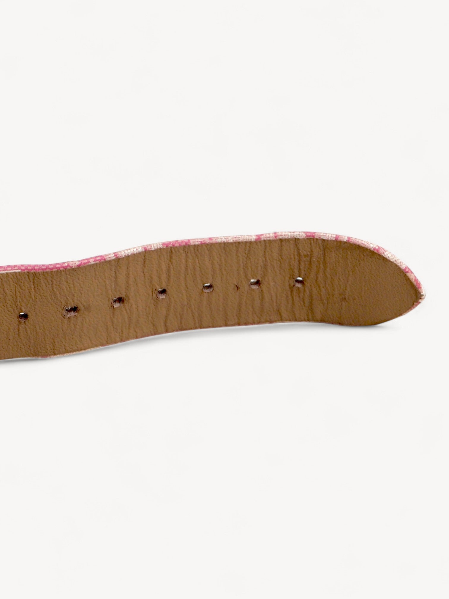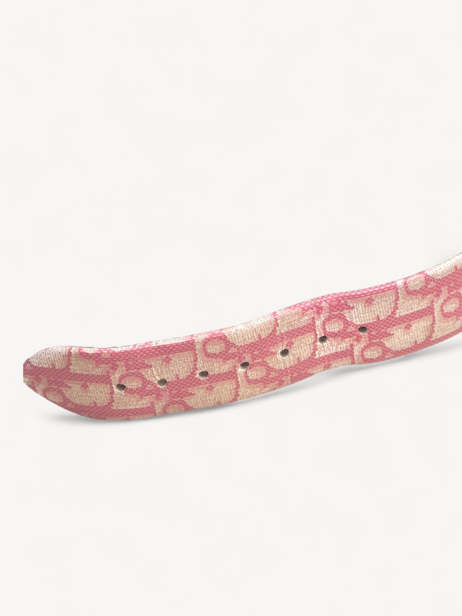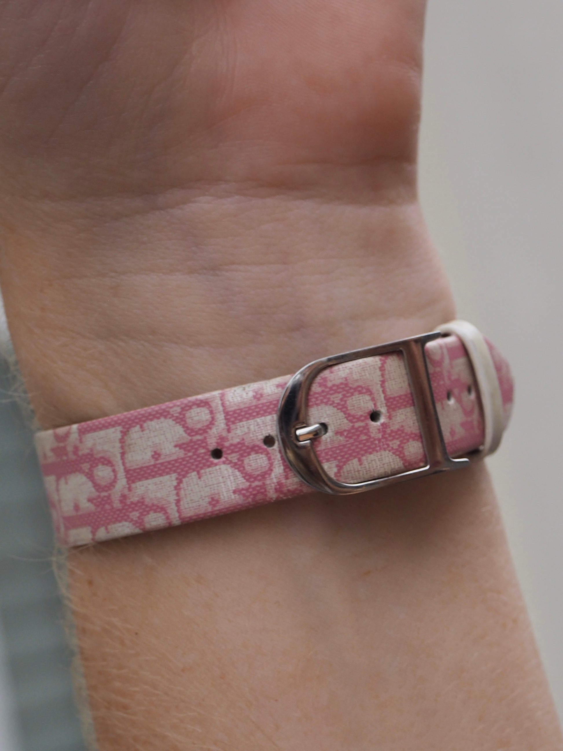 This early 2000s Christian Dior Malice watch features a pink oblique calfskin strap, mother of pearl dial, stainless steel case, and stainless steel D-buckle. Please refer to the images for a detailed view of the item.
