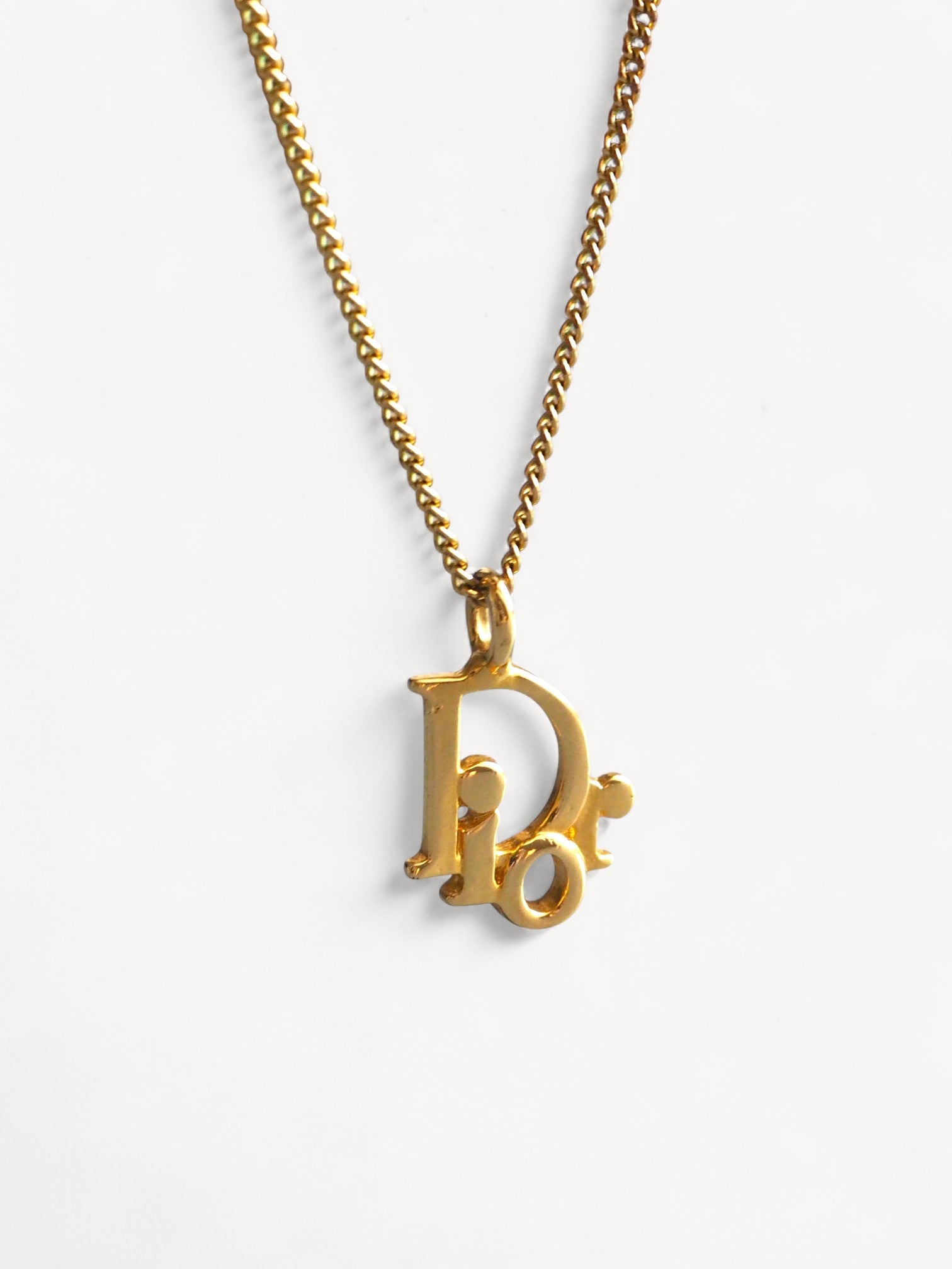 This vintage Christian Dior necklace is crafted from gold-plated stainless steel and features the iconic 'Dior' logo pendant. The necklace has an adjustable length, making it versatile for layering or wearing on its own. Please refer to the images for a detailed view of the item.