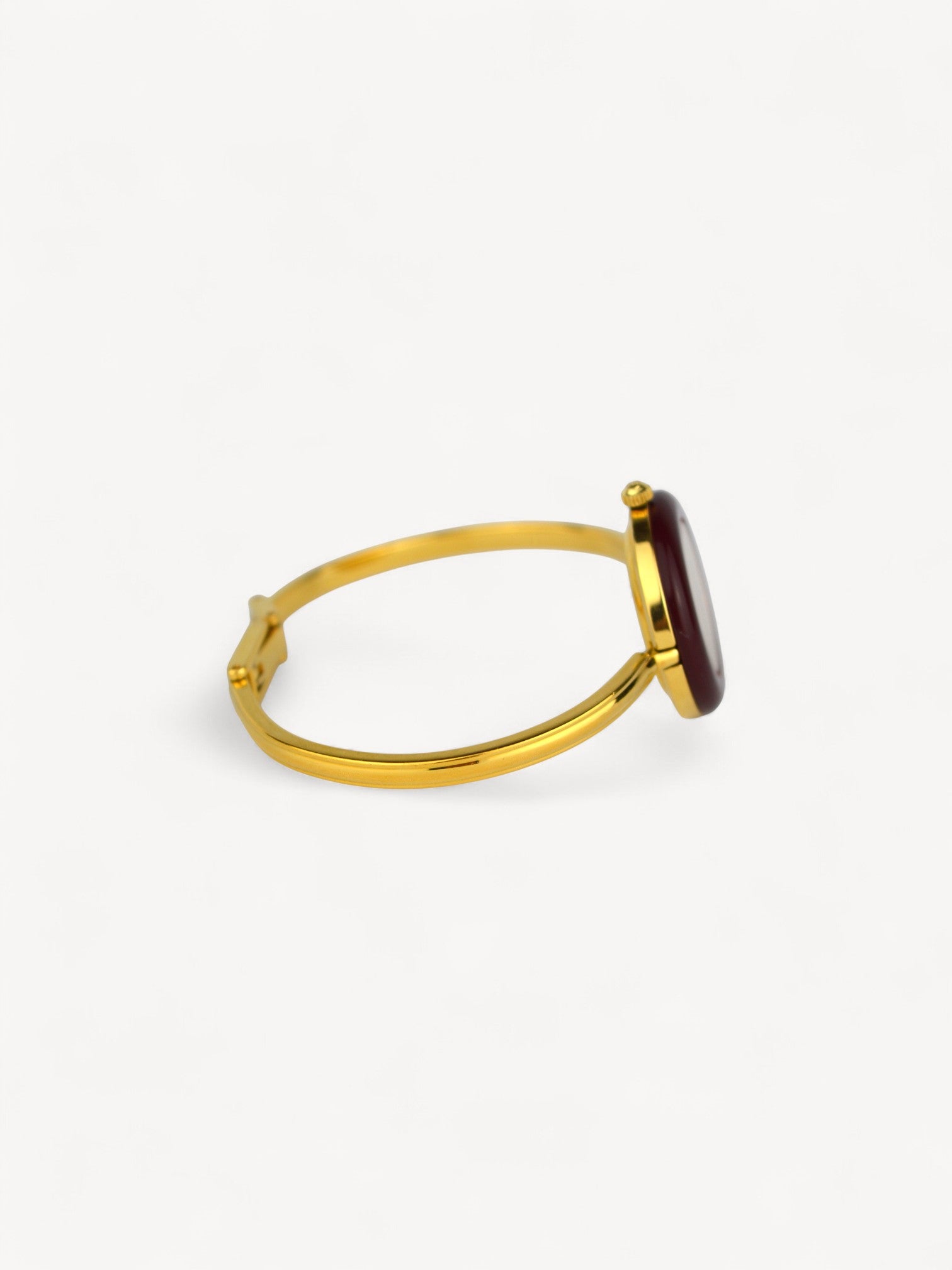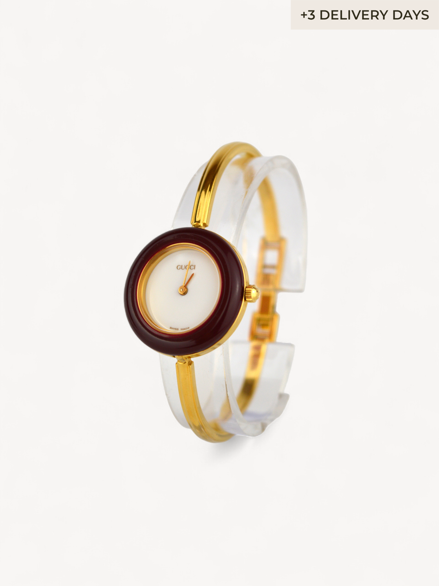This iconic Gucci gold-plated Bezel watch features a bangle-style bracelet and a round face with an attachable burgundy bezel. This piece comes with the burgundy bezel only. The steel shows slight scratches. See images for detailed views.