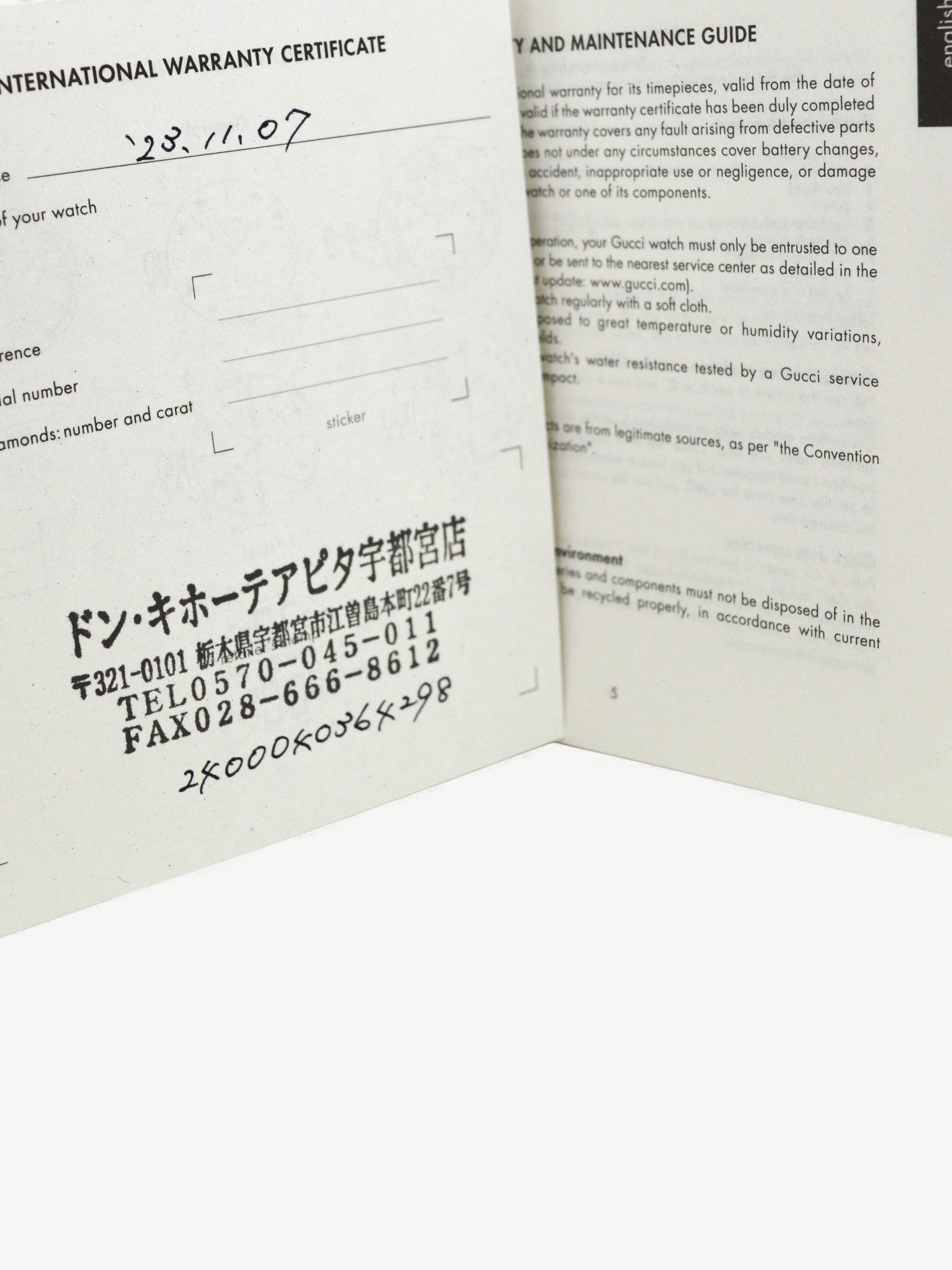 Gucci 1500L watch with the signature horsebit closure and a black rectangular dial with a rhinestone above the 'GUCCI' logo. The watch shows slight scratches on the steel. Protection sticker attached to the back of the case. Please see the photos for a detailed view of the item.
