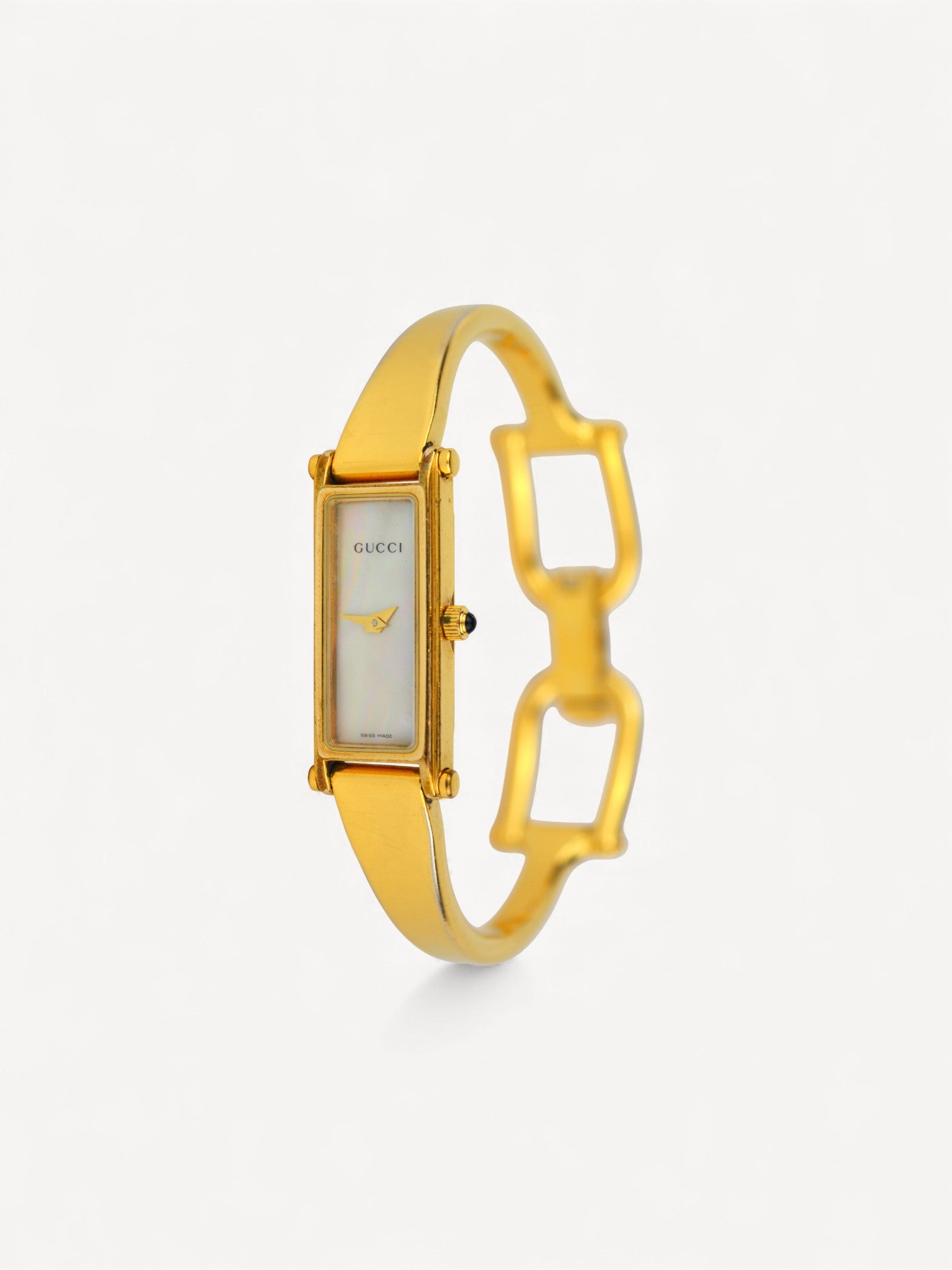 Elegant gold-plated Gucci watch featuring a signature horsebit closure and a rectangular mother-of-pearl dial. The steel shows slight scratches and discoloration. Please see the photos for a detailed view of the item.