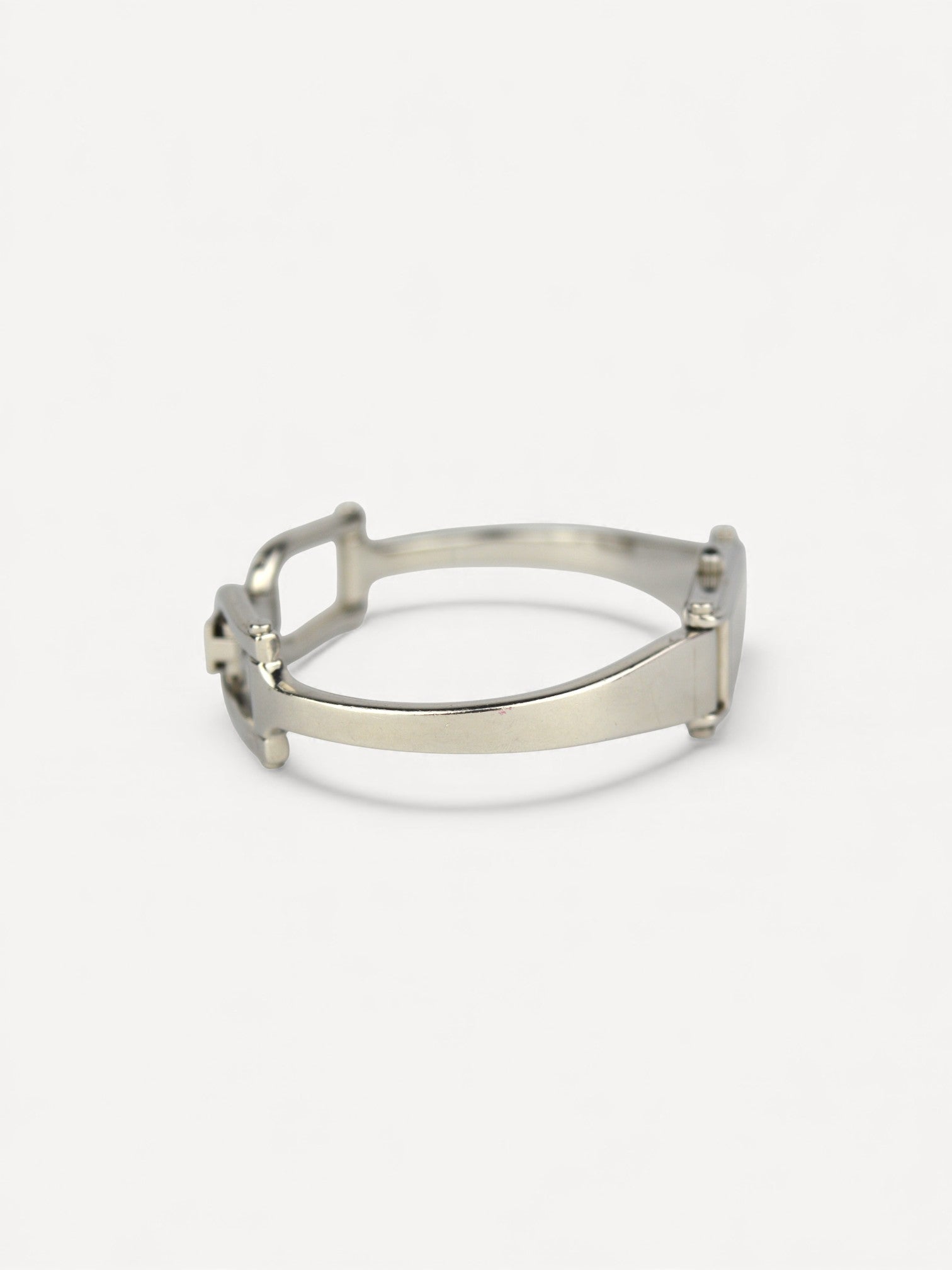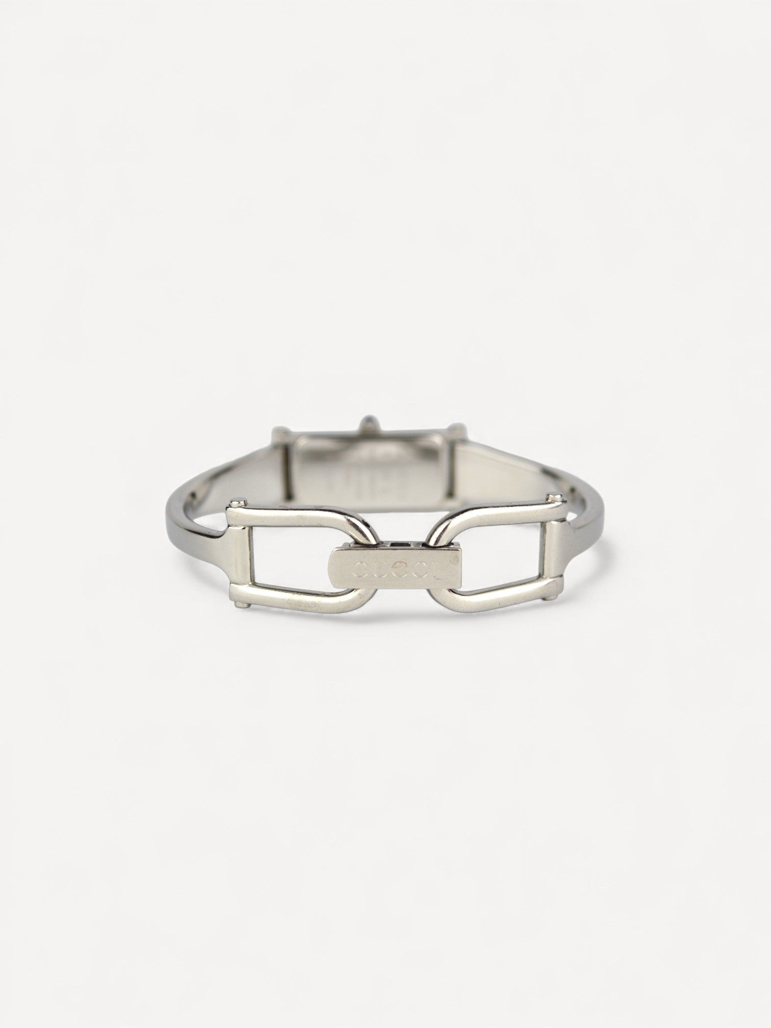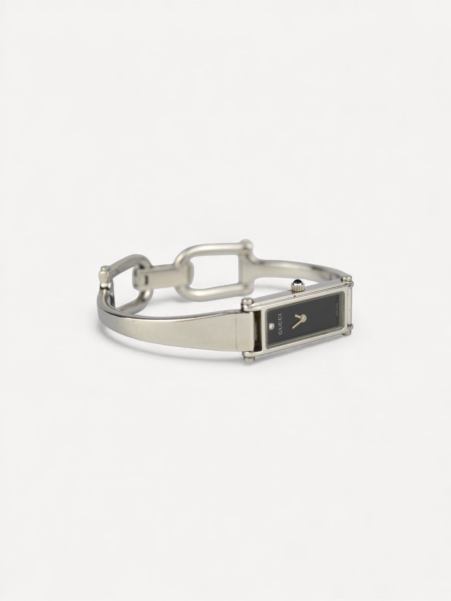 Gucci 1500L watch with the signature horsebit closure and a black rectangular dial with a rhinestone above the 'GUCCI' logo. The steel shows scratches. Please see the photos for a detailed view of the item.