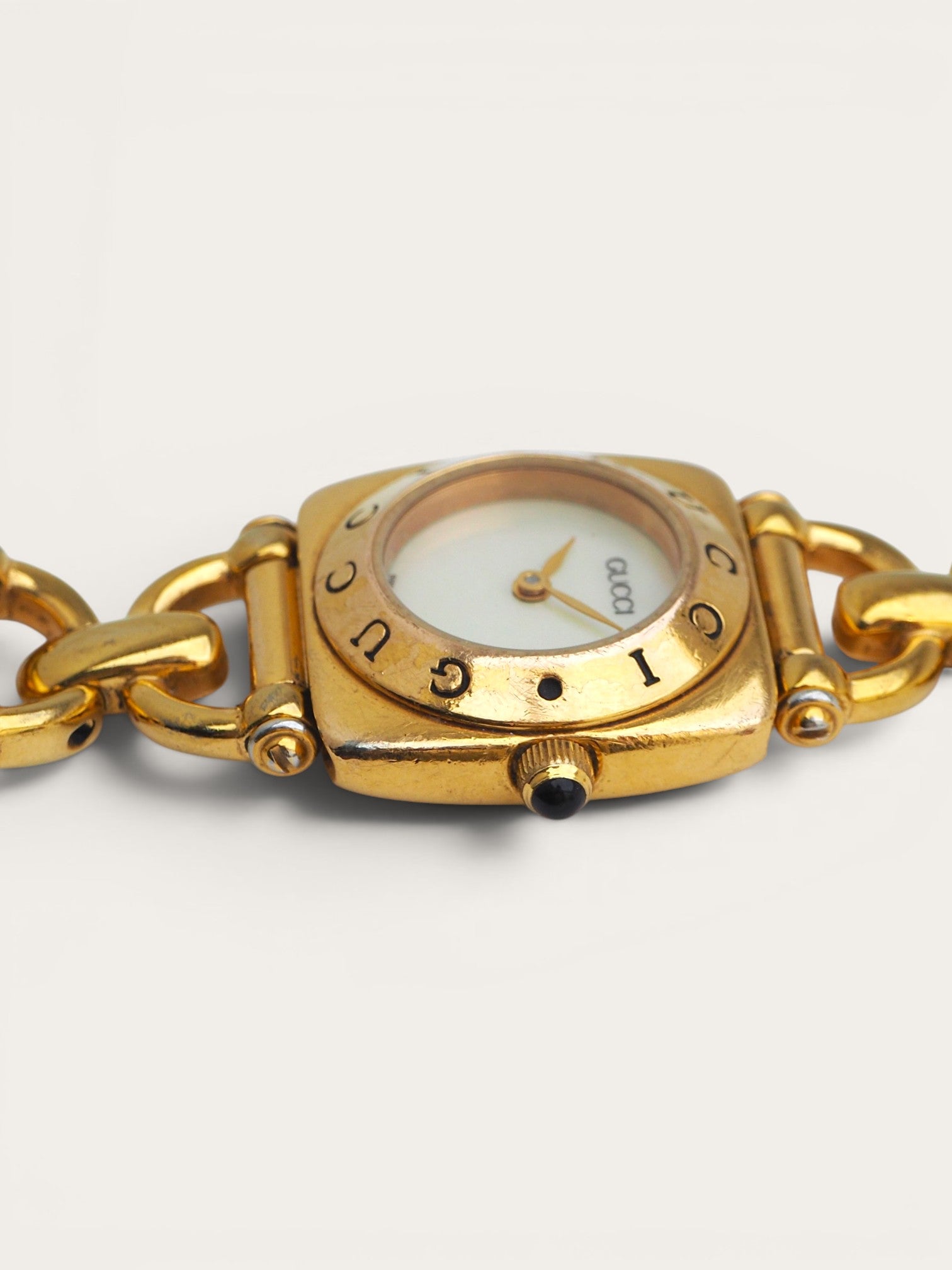 This Gucci 6400L watch in gold features a horsebit-inspired link bracelet, a square case, and a mother-of-pearl dial. The bezel is engraved with the iconic ‘GUCCI’ logo. The steel shows slight scratches and discoloration. The link bracelet is missing one pin; however, this does not affect the wearability. Please refer to the images for a detailed view of the item.