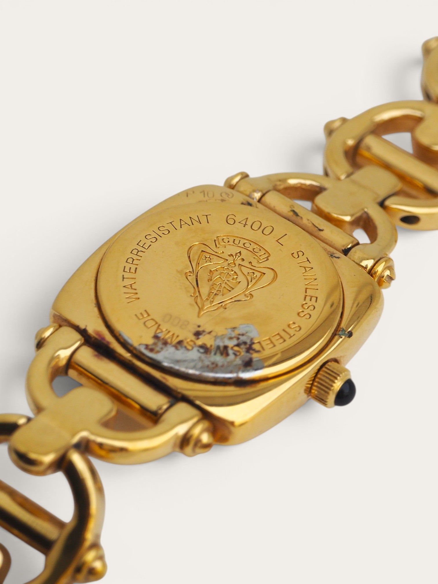 This Gucci 6400L watch is crafted in gold-plated stainless steel and features a horsebit inspired link bracelet, a square case, and a black dial. The bezel is engraved with the iconic 'GUCCI' logo. There are slight scratches on the steel and on the glass. There is some discoloration on the case. Please refer to the images for a detailed view of the item.