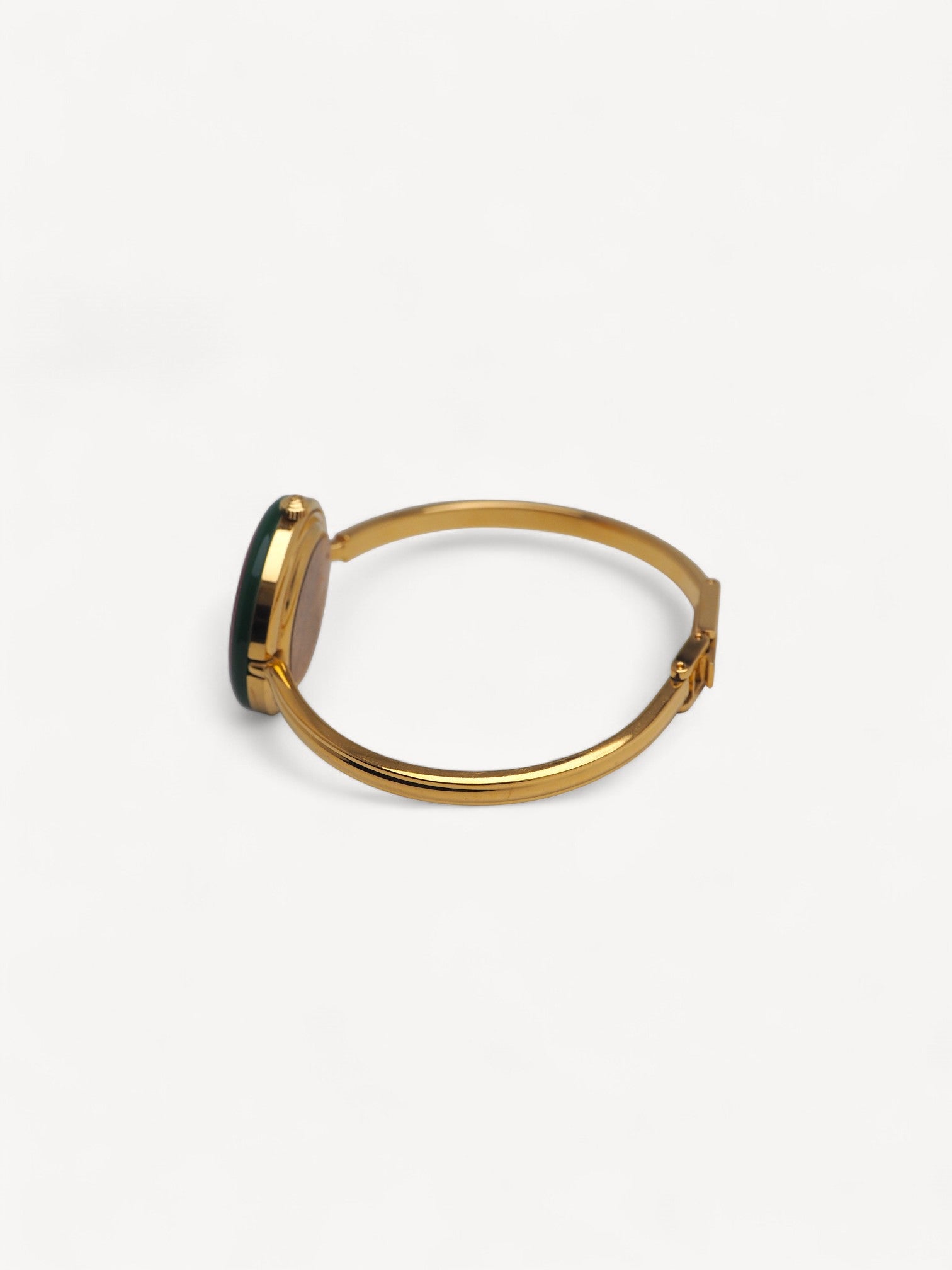 This iconic Gucci Bezel watch features a bangle style bracelet, white dial with gold hands, and 11 interchangeable round bezels. The bezel combination - one gold and ten colorful bezels - makes this set a rare find. The steel shows slight scratches and the light blue bezel shows discoloration. Please refer to the photos for a detailed view of the item.