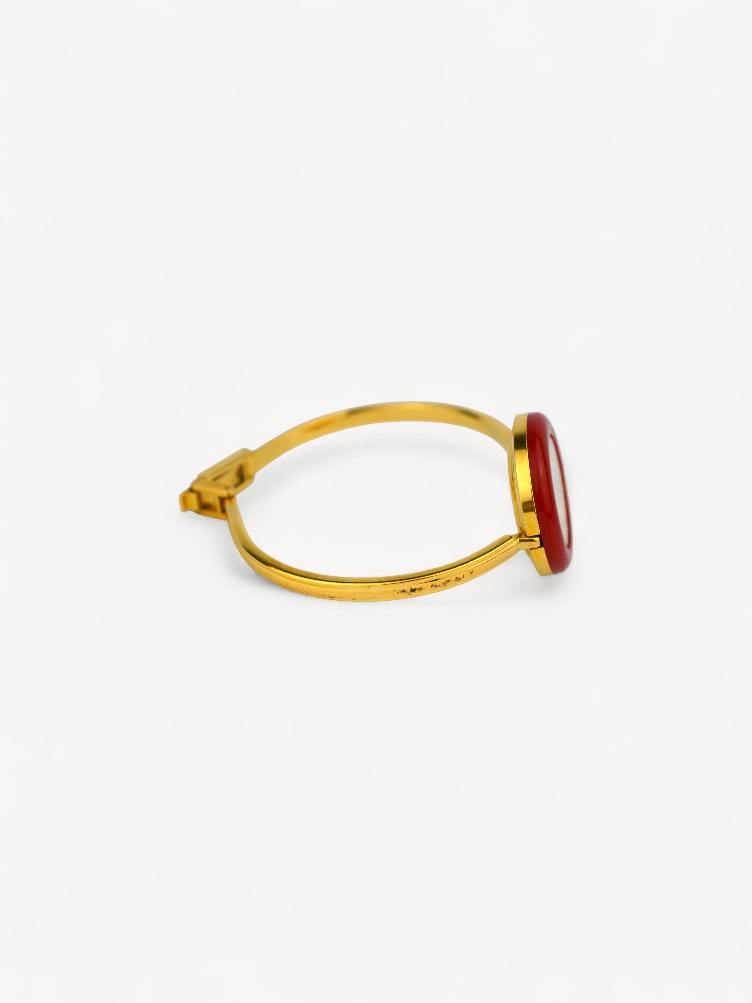 This iconic Gucci Bezel watch features a bangle style bracelet, white dial with gold hands, and 11 interchangeable round bezels. The bracelet shows wear. Please refer to the images for a detailed view of the item.
