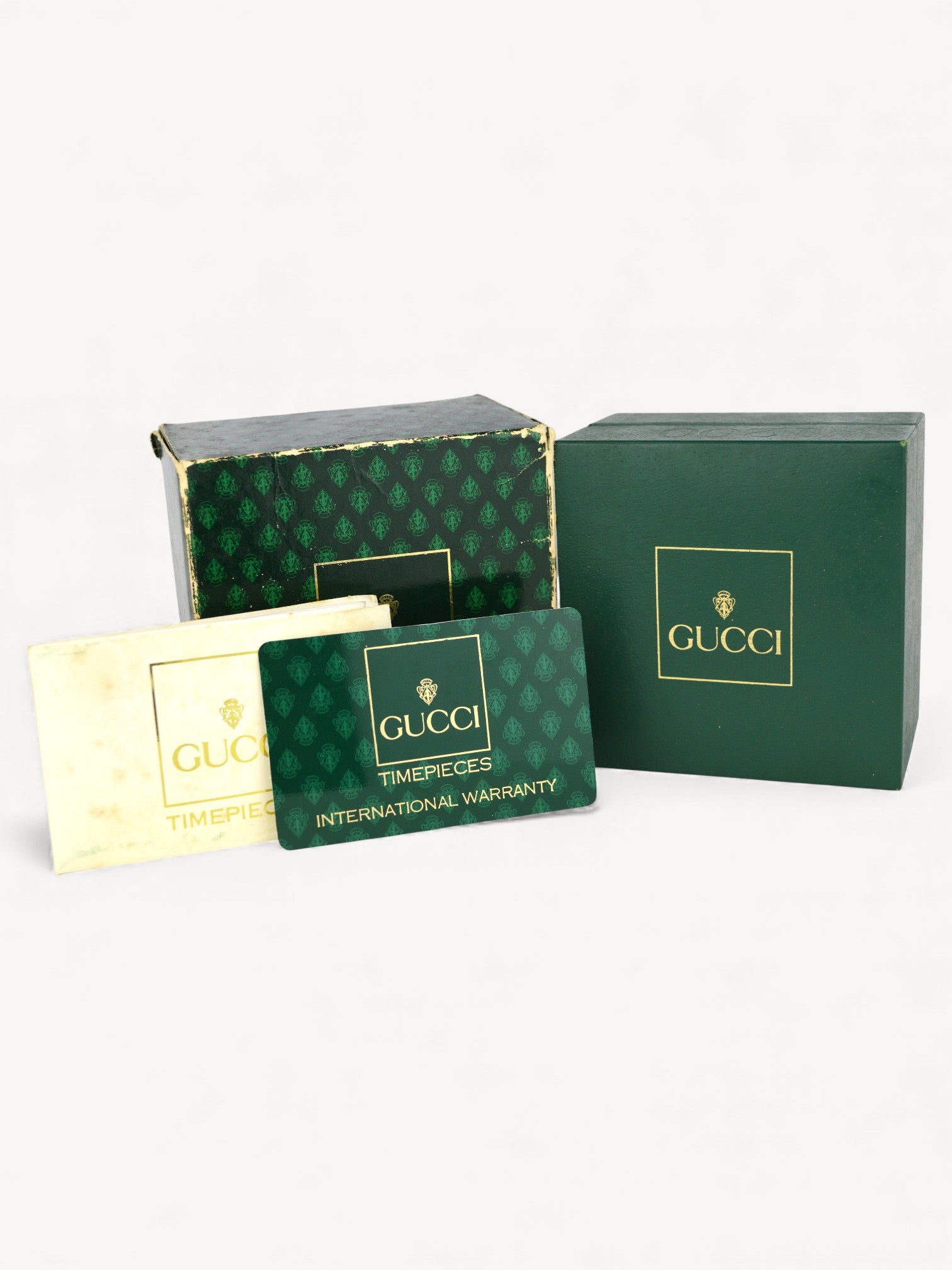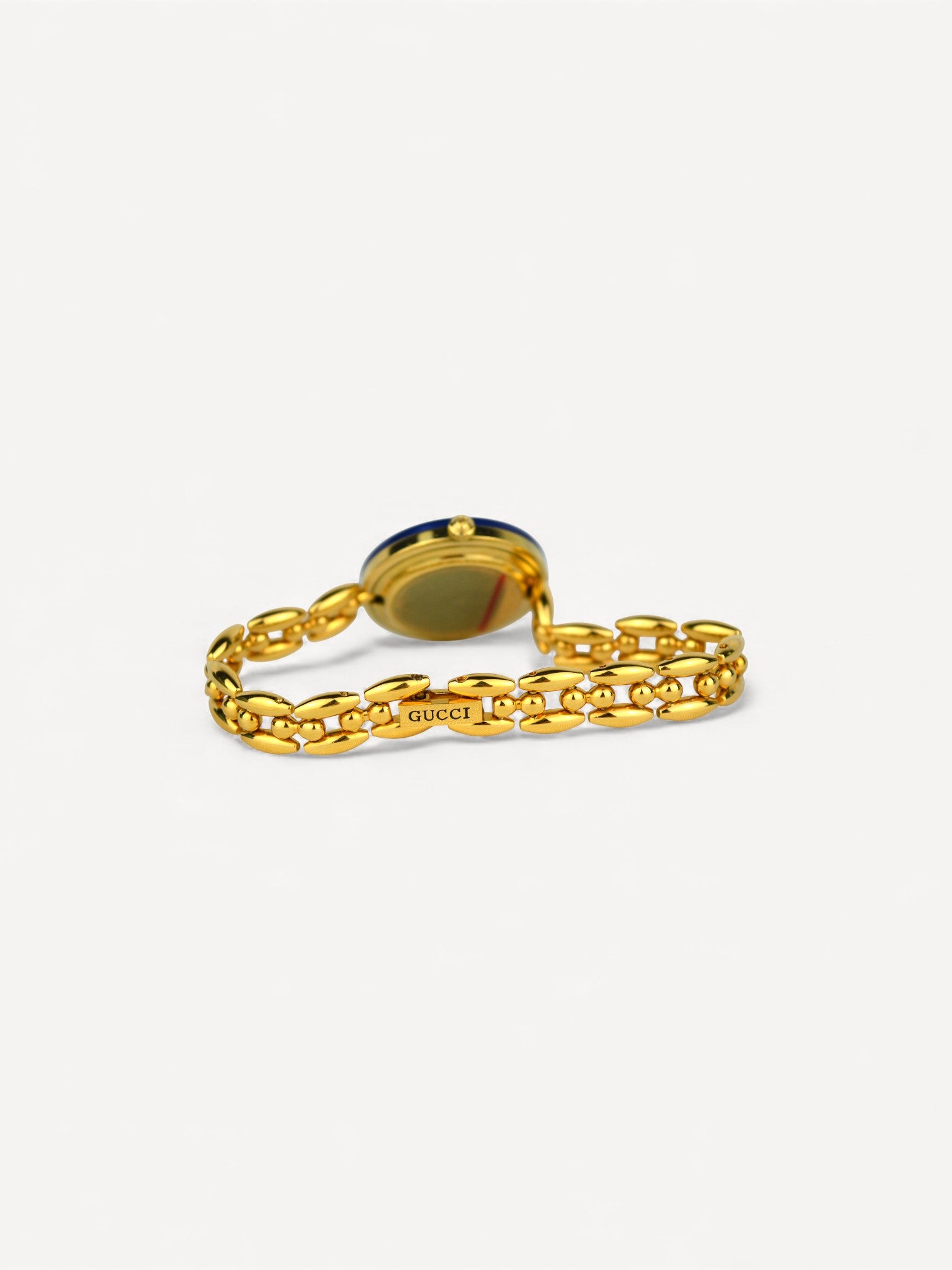 Vintage Gucci Bezel watch with a rice link bracelet. Comes with six interchangeable bezels in metallic tones. The protection sticker is still attached to the back of the case. There are slight scratches on the steel. Please refer to the images for a detailed view of the item.