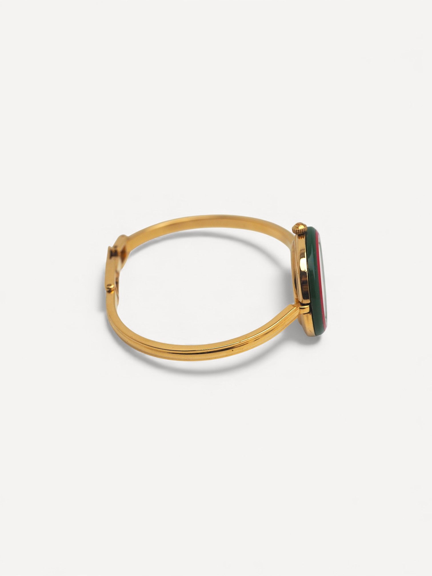 This iconic Gucci Bezel watch features a bangle style bracelet, white dial with gold hands, and 11 interchangeable round bezels. There is a mark on the dial and the white and burgundy bezels show signs of use. Please refer to the images for a detailed view of the item.