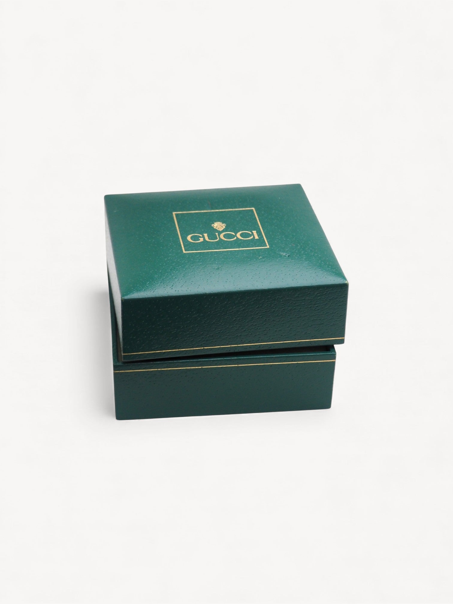 This iconic Gucci Bezel watch features a bangle style bracelet, white dial with gold hands, and 11 interchangeable round bezels. The bracelet shows slight scratches and the box is slightly damaged. The sticker is still attached to the back of the case Please refer to the images for a detailed view of the item.