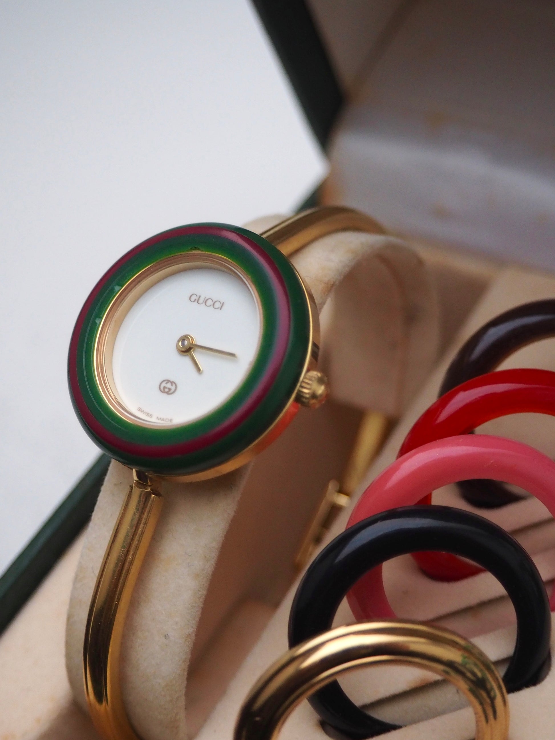 1990s vintage Gucci Bezel watch with gold-plated bangle bracelet. It includes the classic gold bezel plus 10 vibrant colored bezels, making this set a rare find. Please refer to the images for a detailed view of the item.