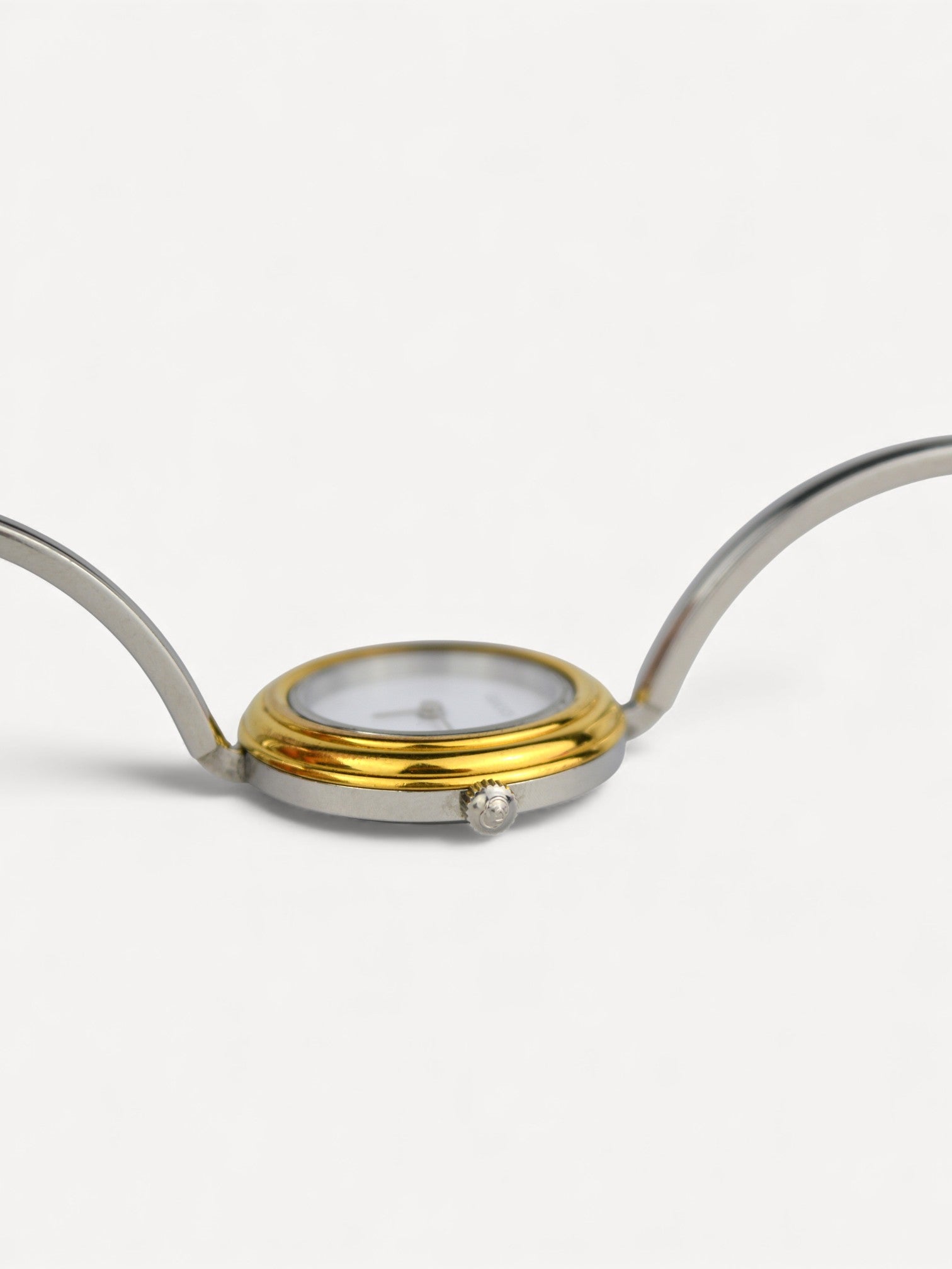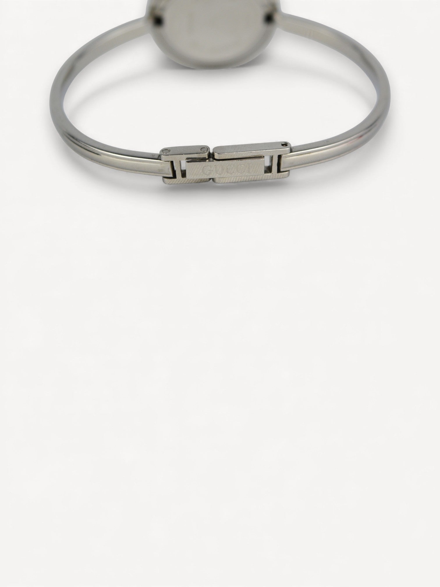 This iconic Gucci Bezel watch features a bangle style bracelet, white dial with silver hands, and 11 interchangeable round bezels. There are slight scratches on the steel. Please refer to the images for a detailed view of the item.