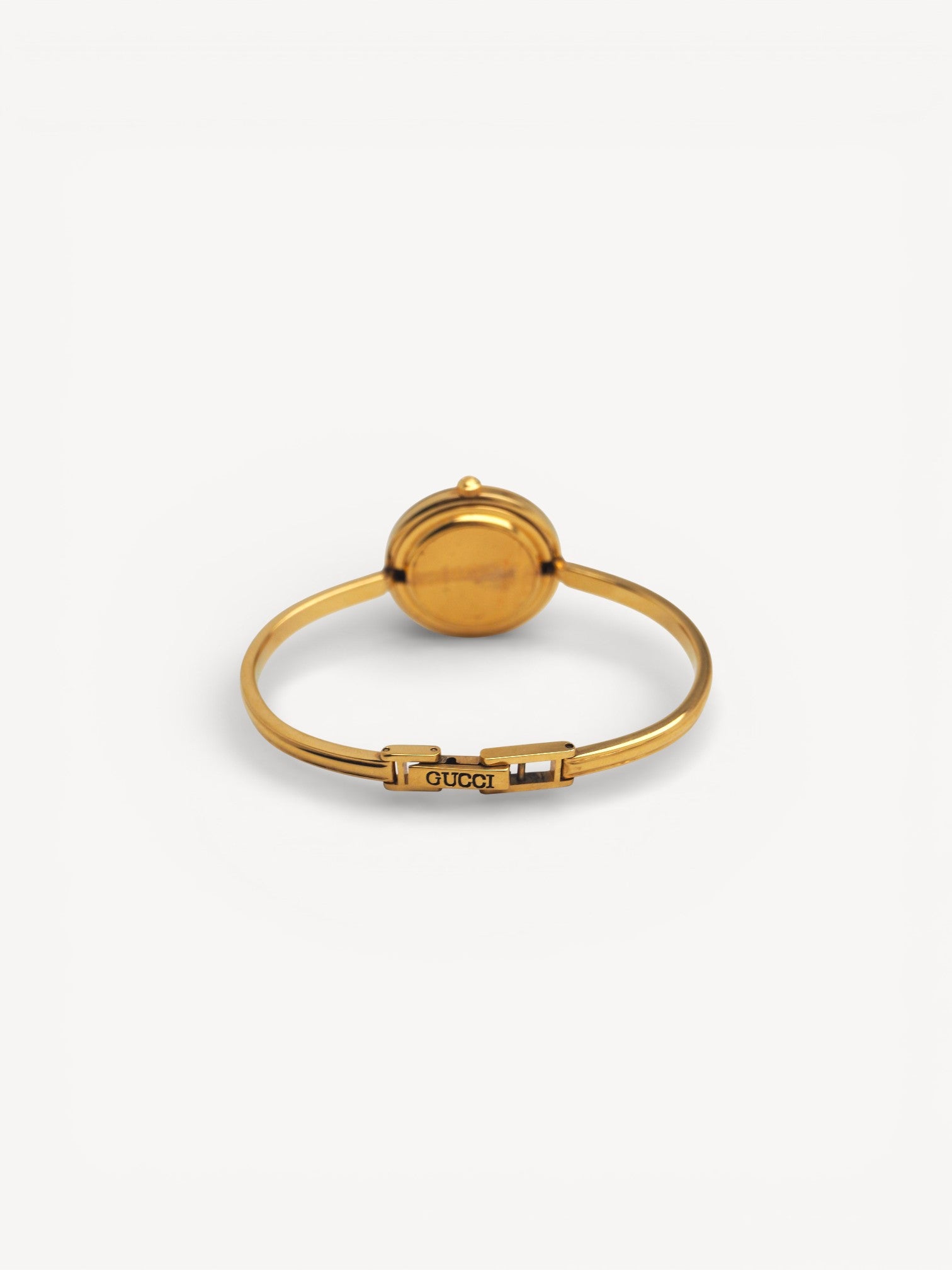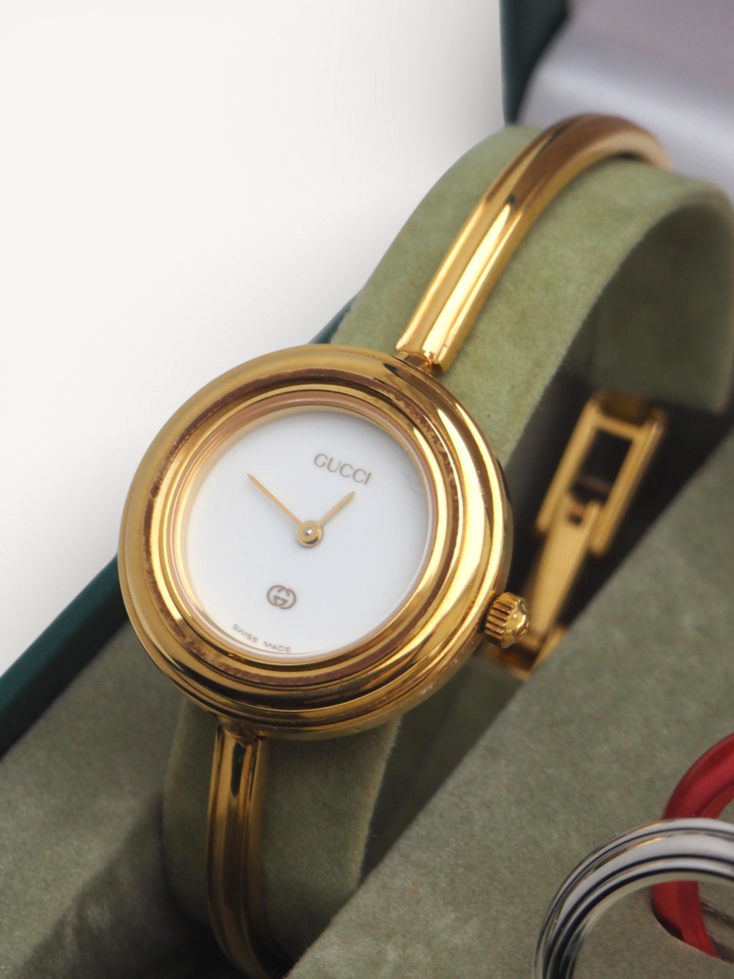 This iconic Gucci Bezel watch features a bangle style bracelet, white dial with gold hands, and comes with 6 metallic interchangeable bezels. The bangle-style bracelet paired with metallic interchangeable bezels, is a combination that is increasingly hard to find. The protection sticker is still attached to the back of the case. There are hairline scratches on the steel and the gold bezel shows slight signs of use. Please refer to the images for a detailed view of the item. This item is in very good condition, with hairline scratches on the steel. Please refer to the images for a detailed view of the item.