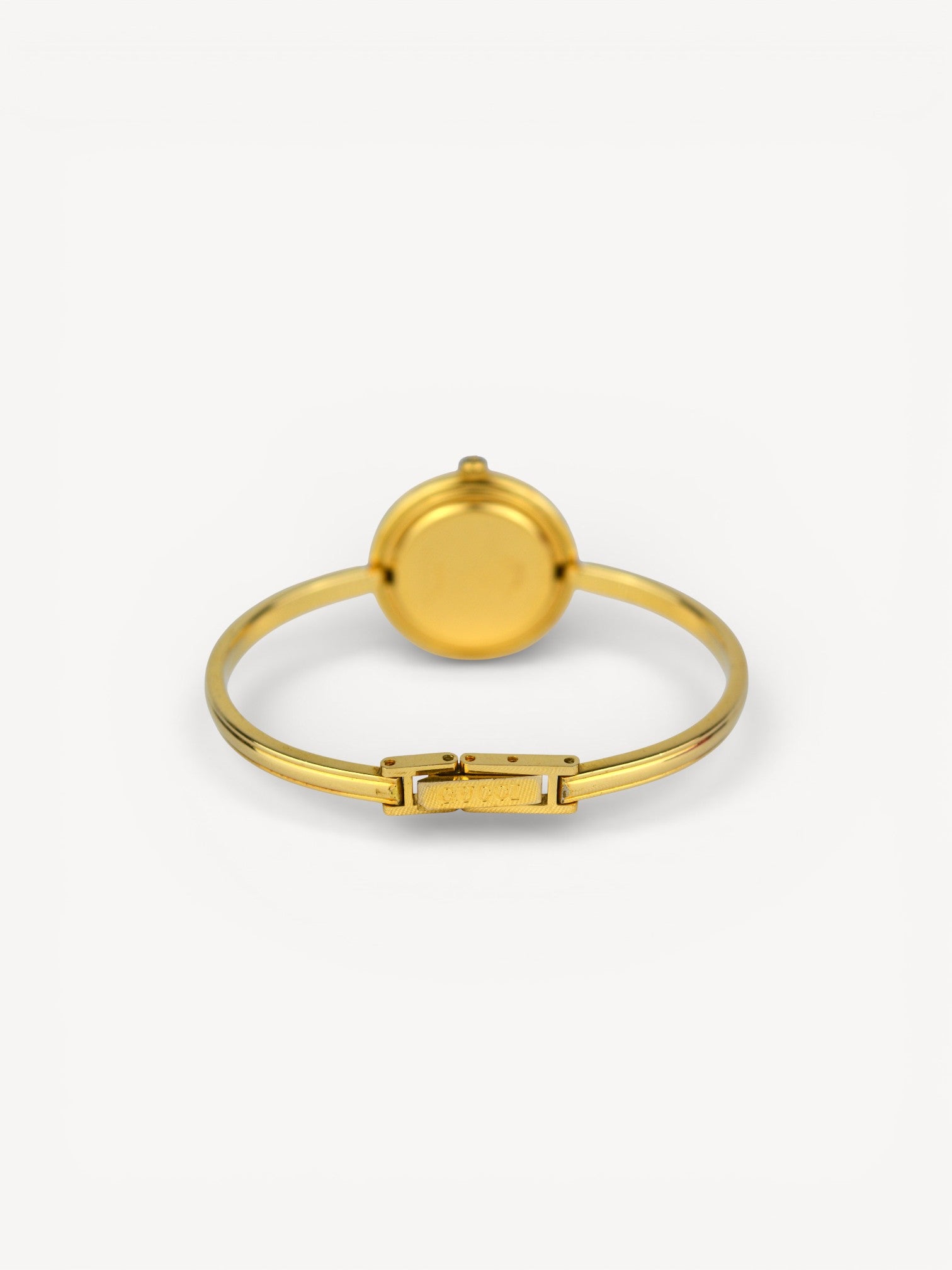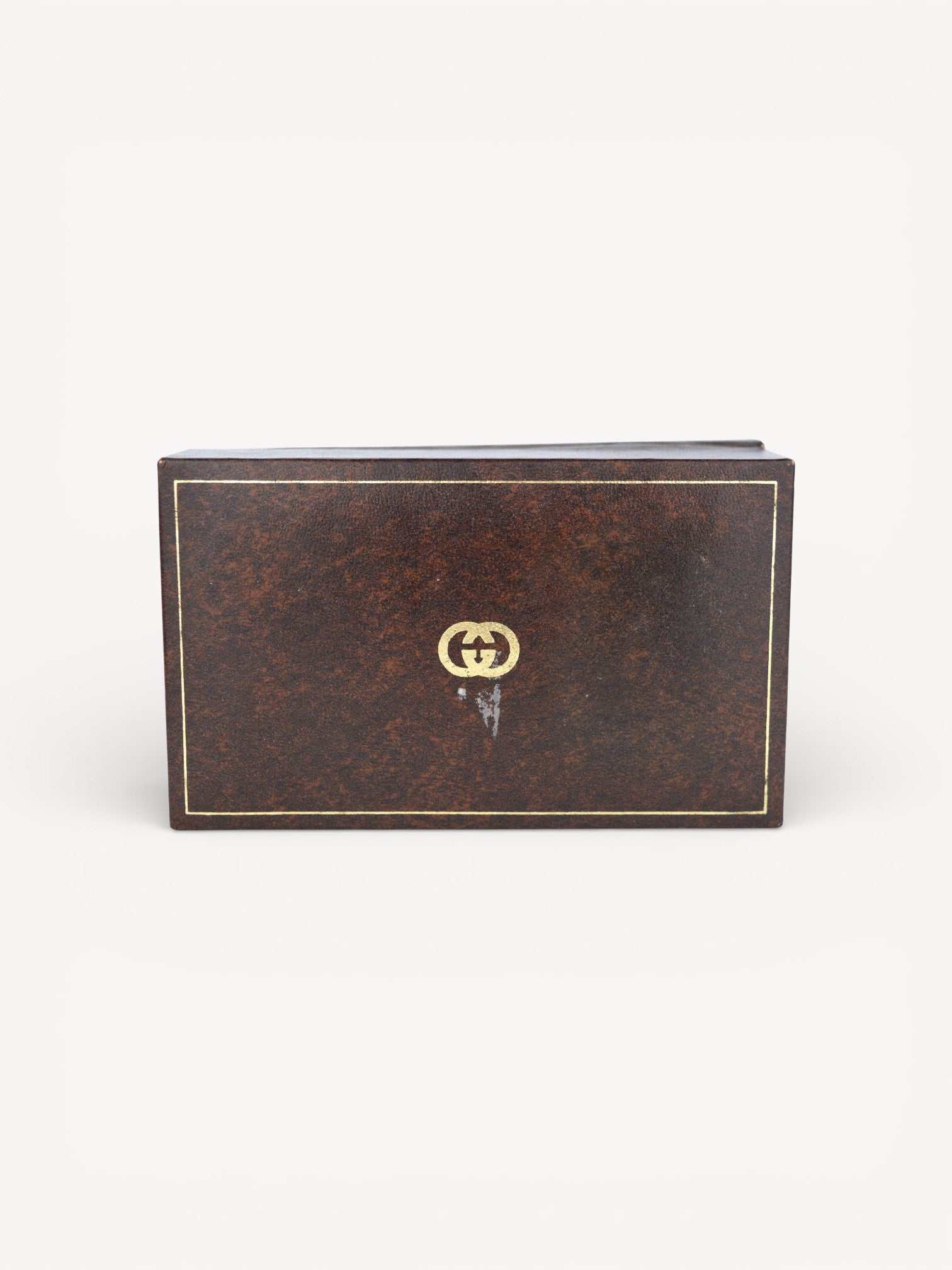 This iconic Gucci Bezel watch features a bangle style bracelet, white dial with gold hands, and 11 interchangeable round bezels. There are light scratches on the steel and signs of use on the crown. The box is slightly damaged. Please refer to the images for a detailed view of the item.