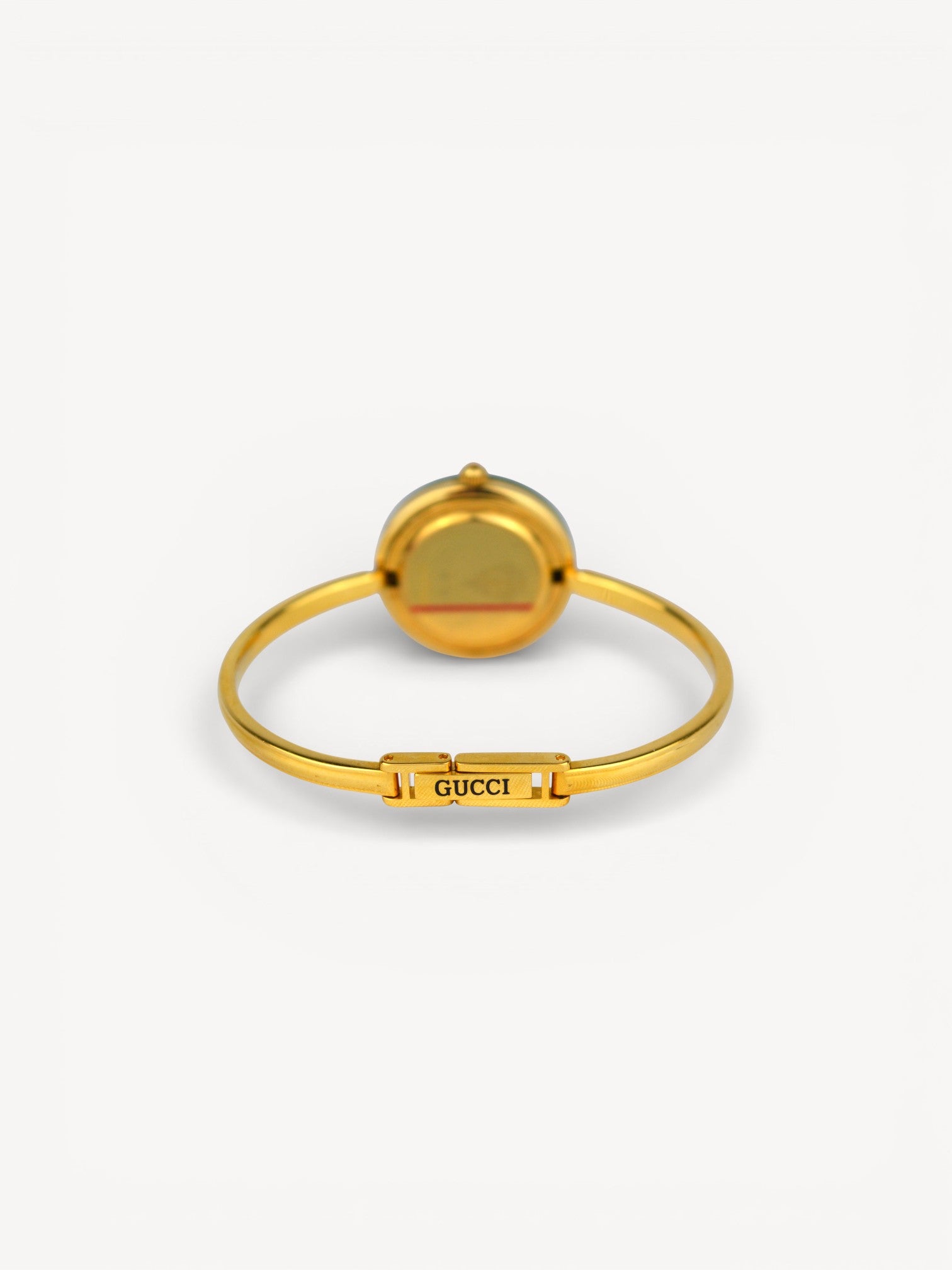 This iconic Gucci Bezel watch features a bangle style bracelet, white dial with gold hands, and 11 interchangeable round bezels. This item is in very good condition, with hairline scratches on the steel. Please refer to the images for a detailed view of the item.