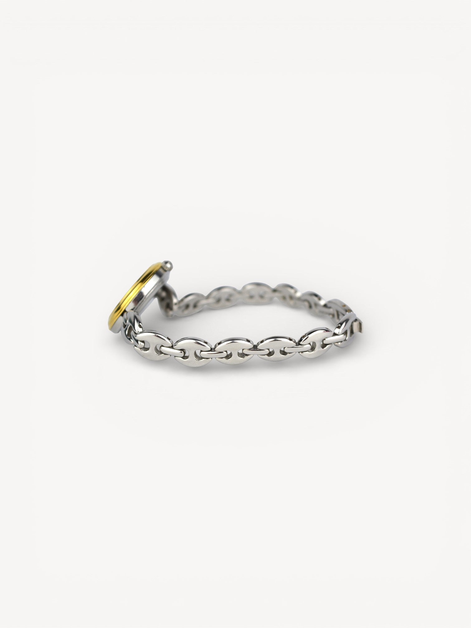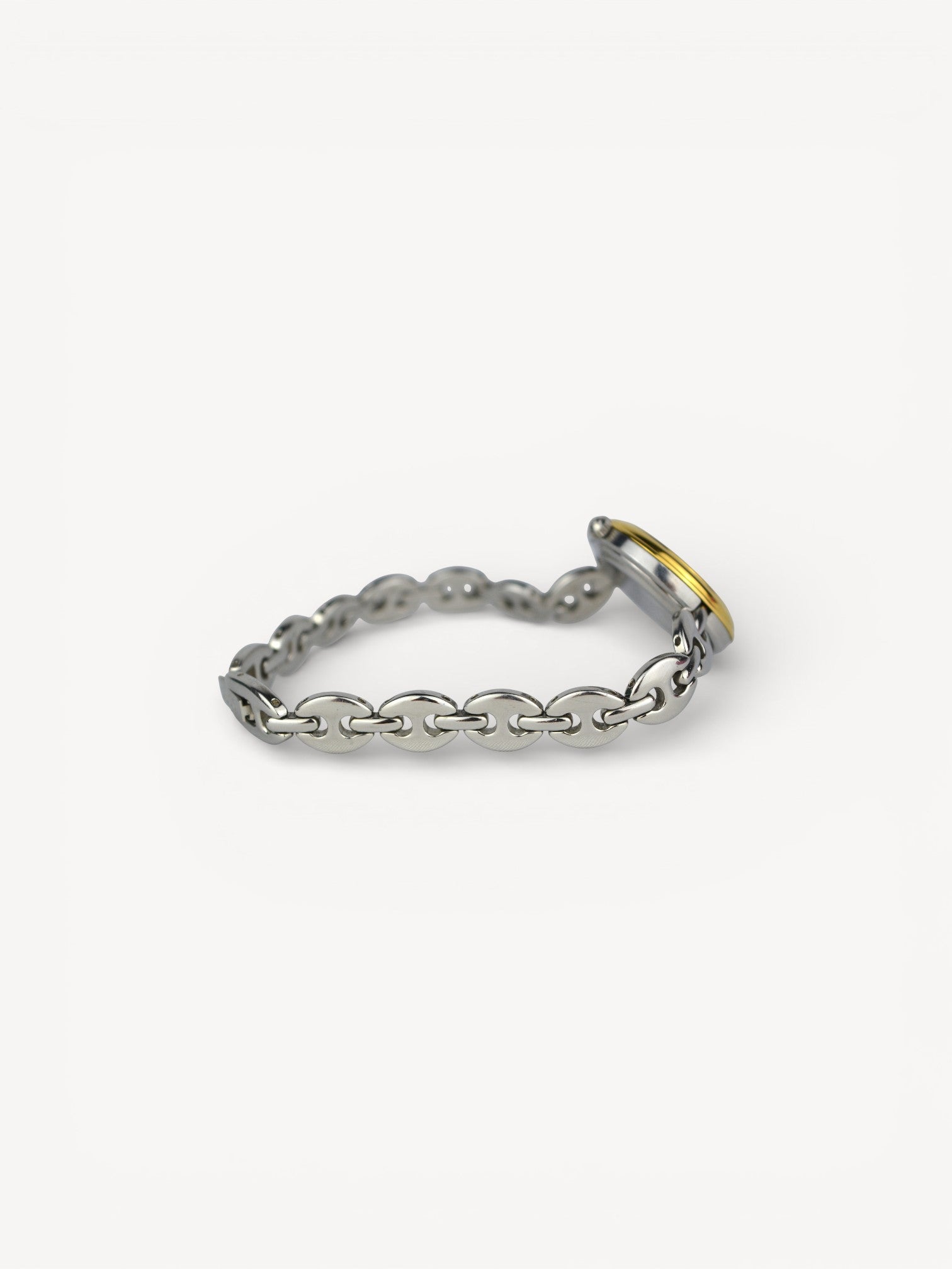 This iconic Gucci Bezel watch features a puffed mariner bracelet bracelet, white dial with silver hands, and 6 interchangeable round bezels. There are slight scratches on the steel. Please refer to the images for a detailed view of the item.
