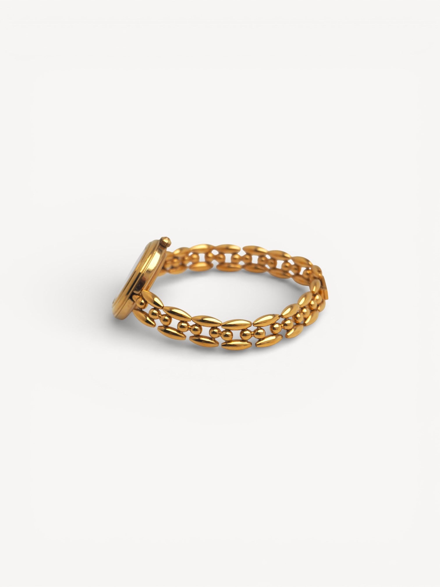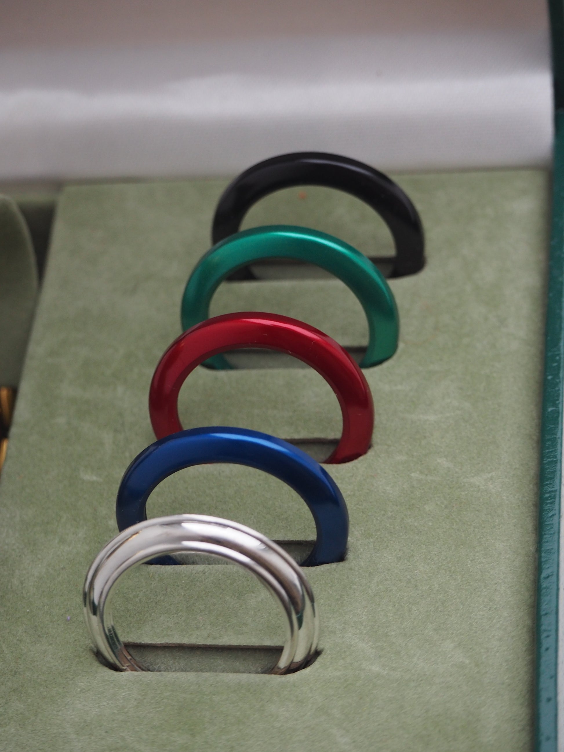 Vintage Gucci Bezel watch with a rice link bracelet. Comes with six interchangeable bezels in metallic tones. The protection sticker is still attached to the back of the case. There are slight scratches on the steel and minor dots on the dial. Please refer to the images for a detailed view of the item.