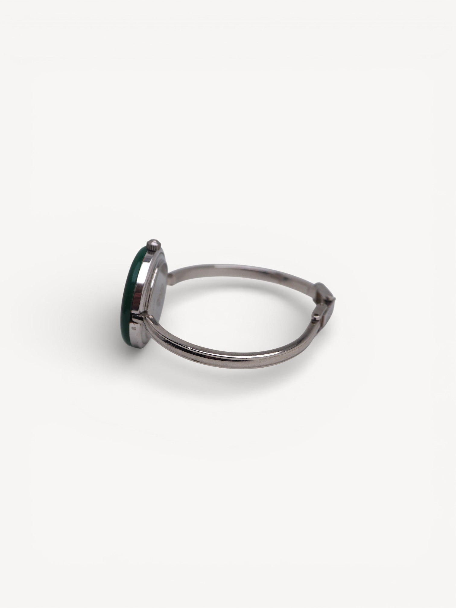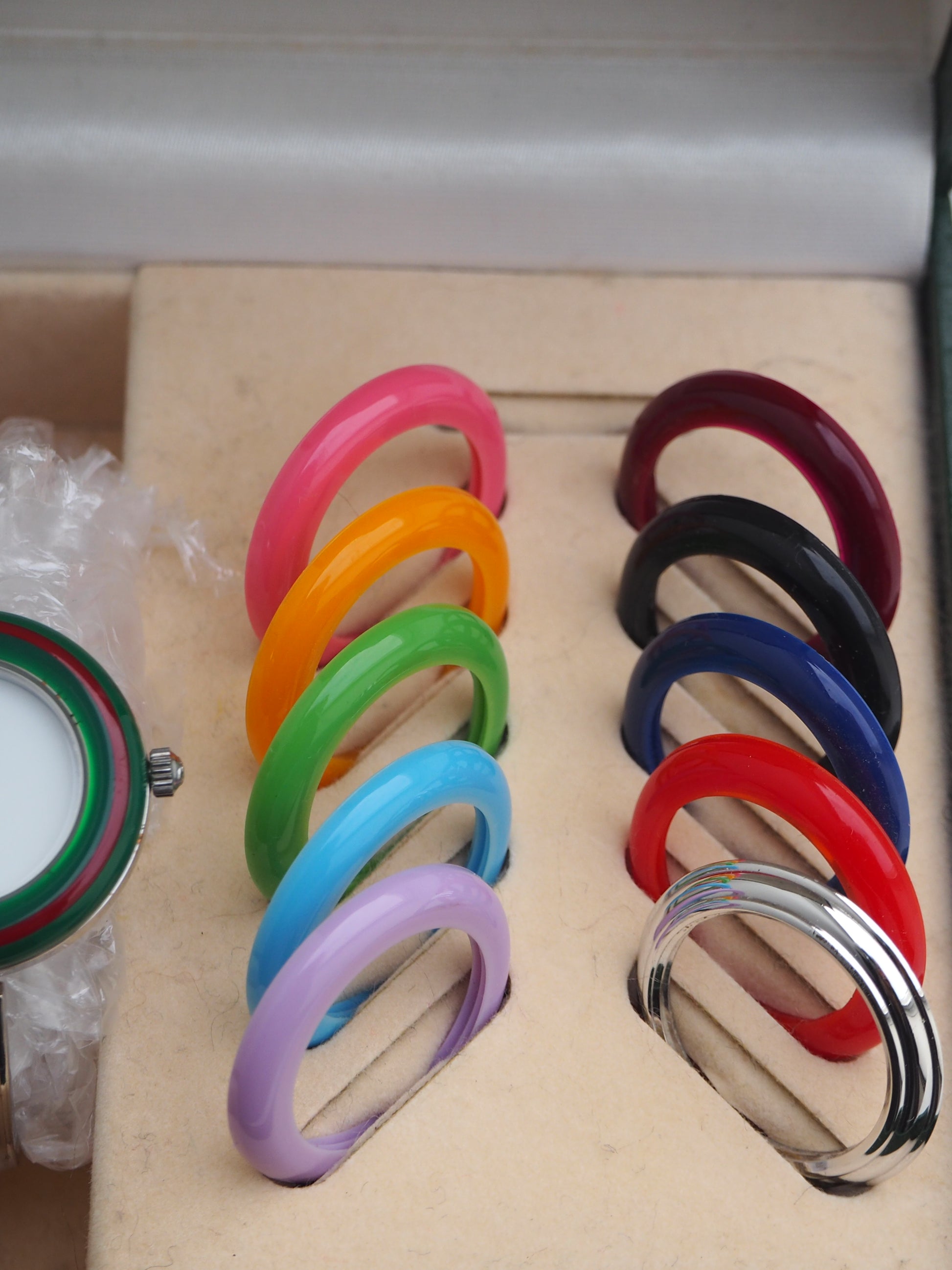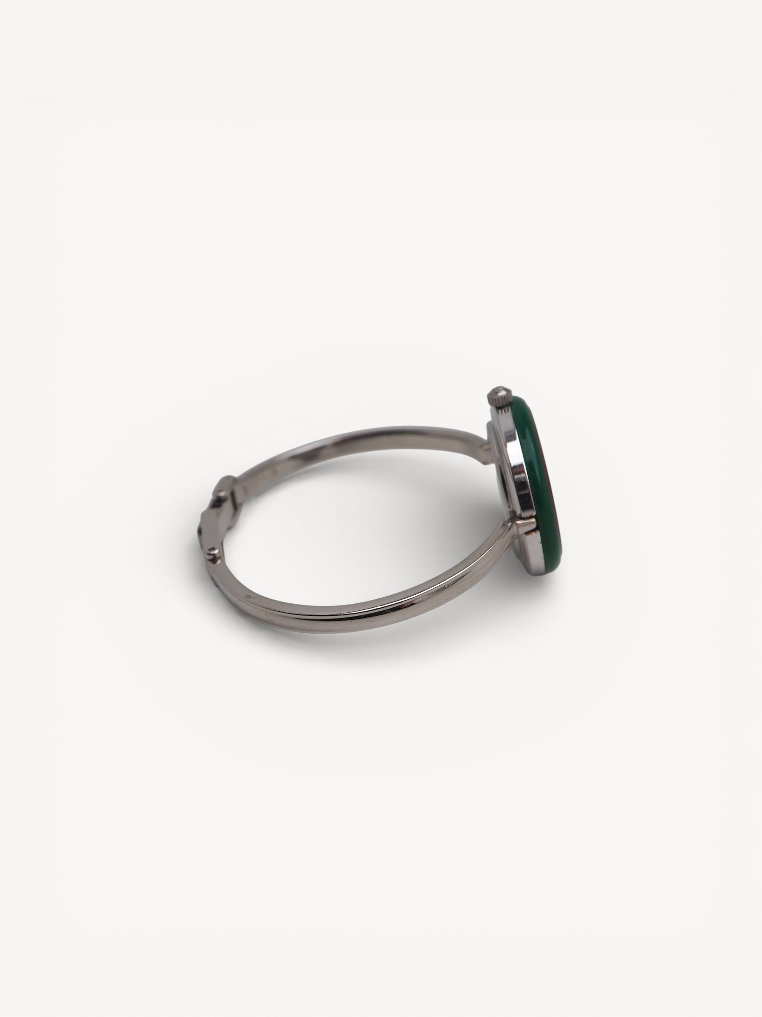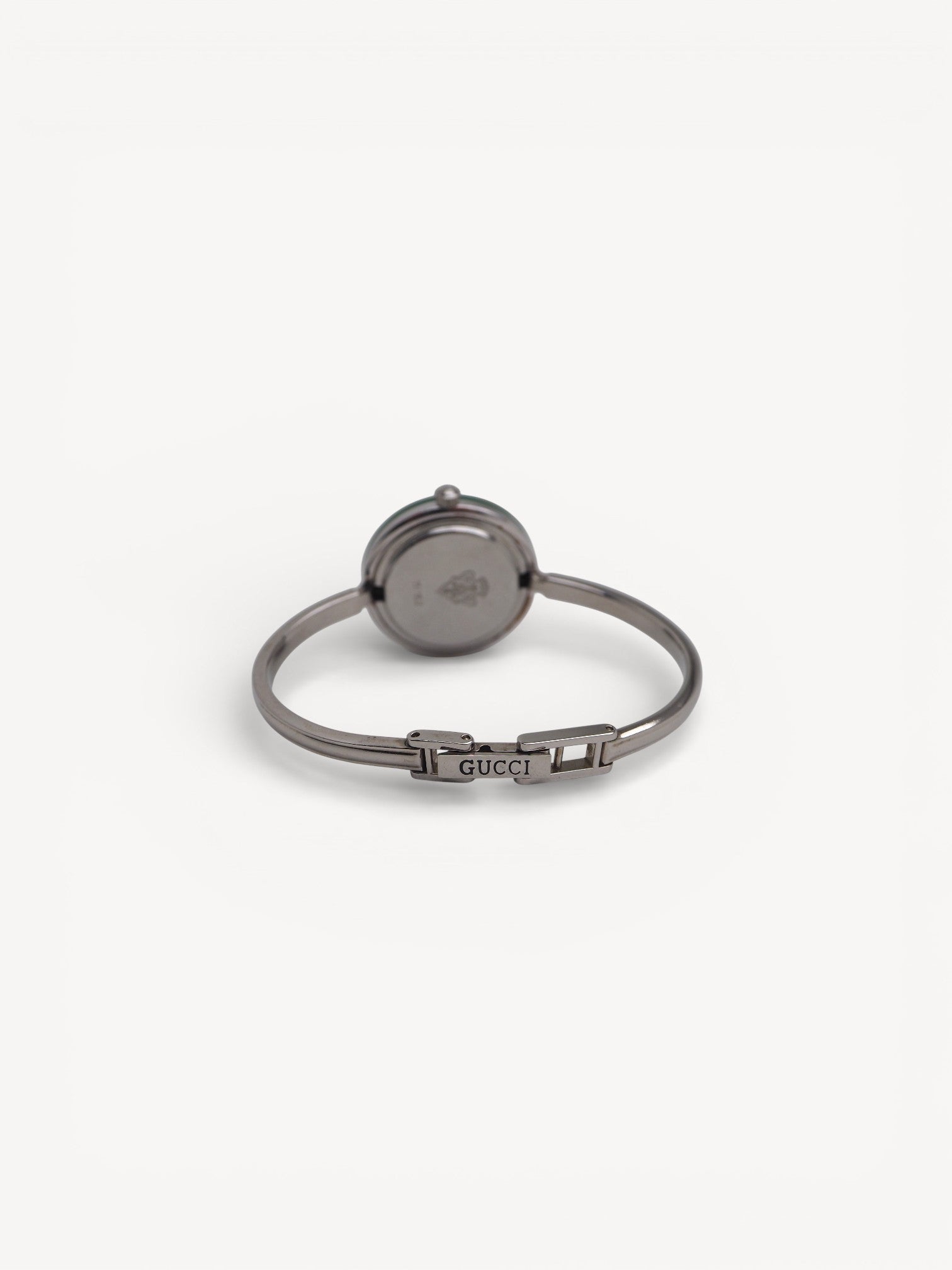 Rare find! The Gucci Interchangeable bezel watch size Small has a circumference of 15 cm (= 5.9 inches). This iconic watch is crafted from stainless steel and features a bangle style bracelet, white dial with solver hands, and 11 interchangeable round bezels. There are hairline scratches on the steel. Please refer to the images for a detailed view of the item.