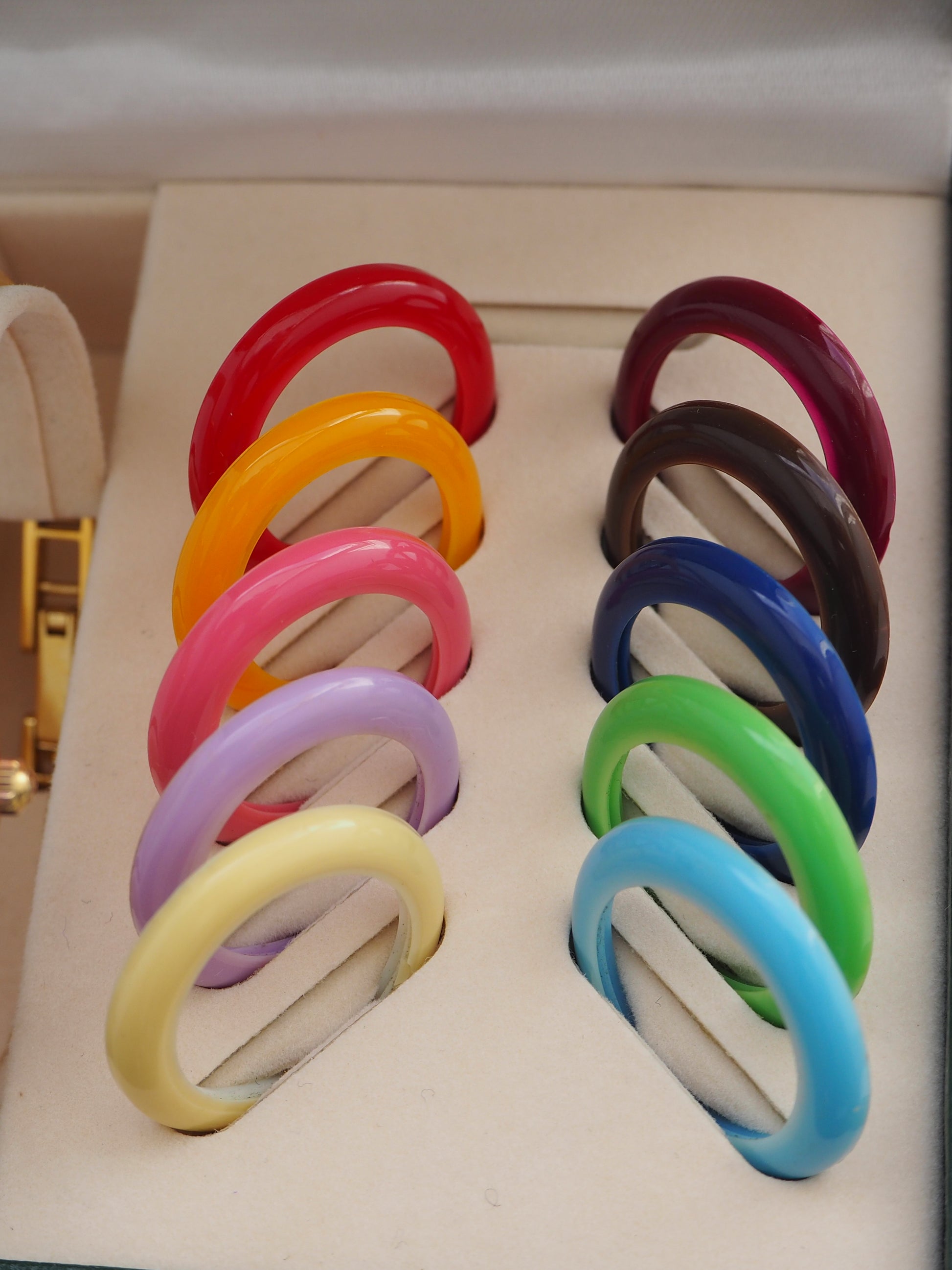 Rare find! The Gucci Interchangeable bezel watch with a circumference of 17 cm (= 6.7 inches). This iconic watch is crafted from gold-plated stainless steel and features a bangle style bracelet, white dial with gold hands, and 11 interchangeable round bezels. This item is in very good condition overall. The glass shows a few hairline scratches and a tiny black speck, while the steel also has some hairline scratches. These signs of wear are only noticeable upon close inspection. Please refer to the images for a detailed view of the item.