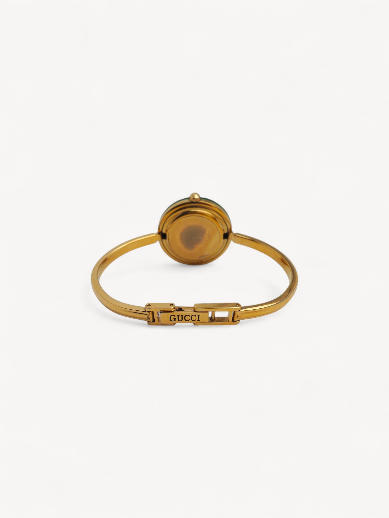 The iconic Gucci watch is crafted from gold-plated stainless steel and features a bangle style bracelet, white dial with gold hands, and 11 interchangeable round bezels. The protection sticker is still attached to the back of the case. Please refer to the images for a detailed view of the item.