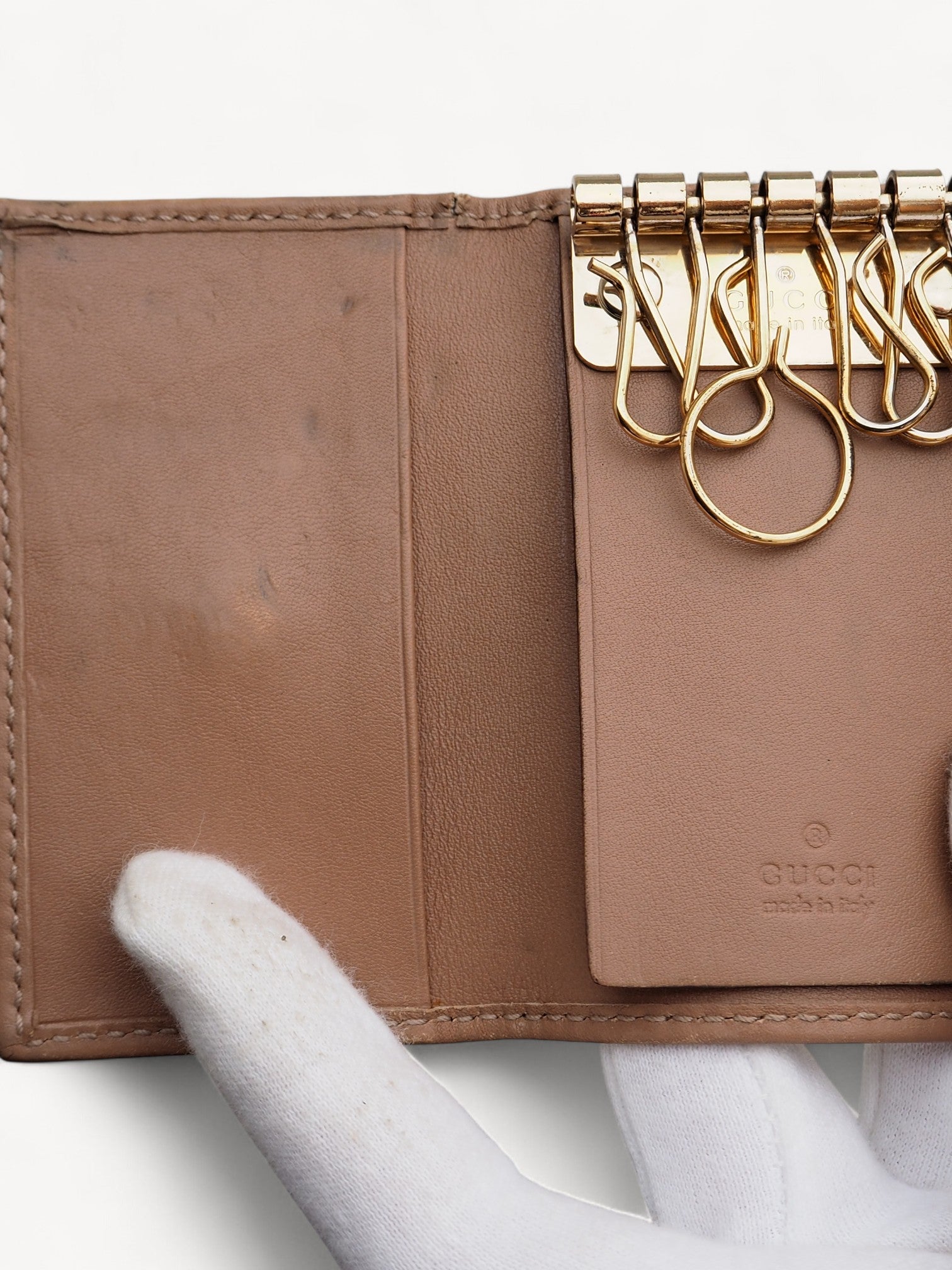 This Gucci key holder is crafted from the iconic GG monogram canvas with dusty pink leather trim. The front is detailed with a matching leather bow and gold-tone GG emblem. A true essential every woman needs to protect the interior of her bag from scratches and key marks. The snap button closure opens to a dusty pink leather interior with 6 key hooks. Please refer to the images for a detailed view of the item.