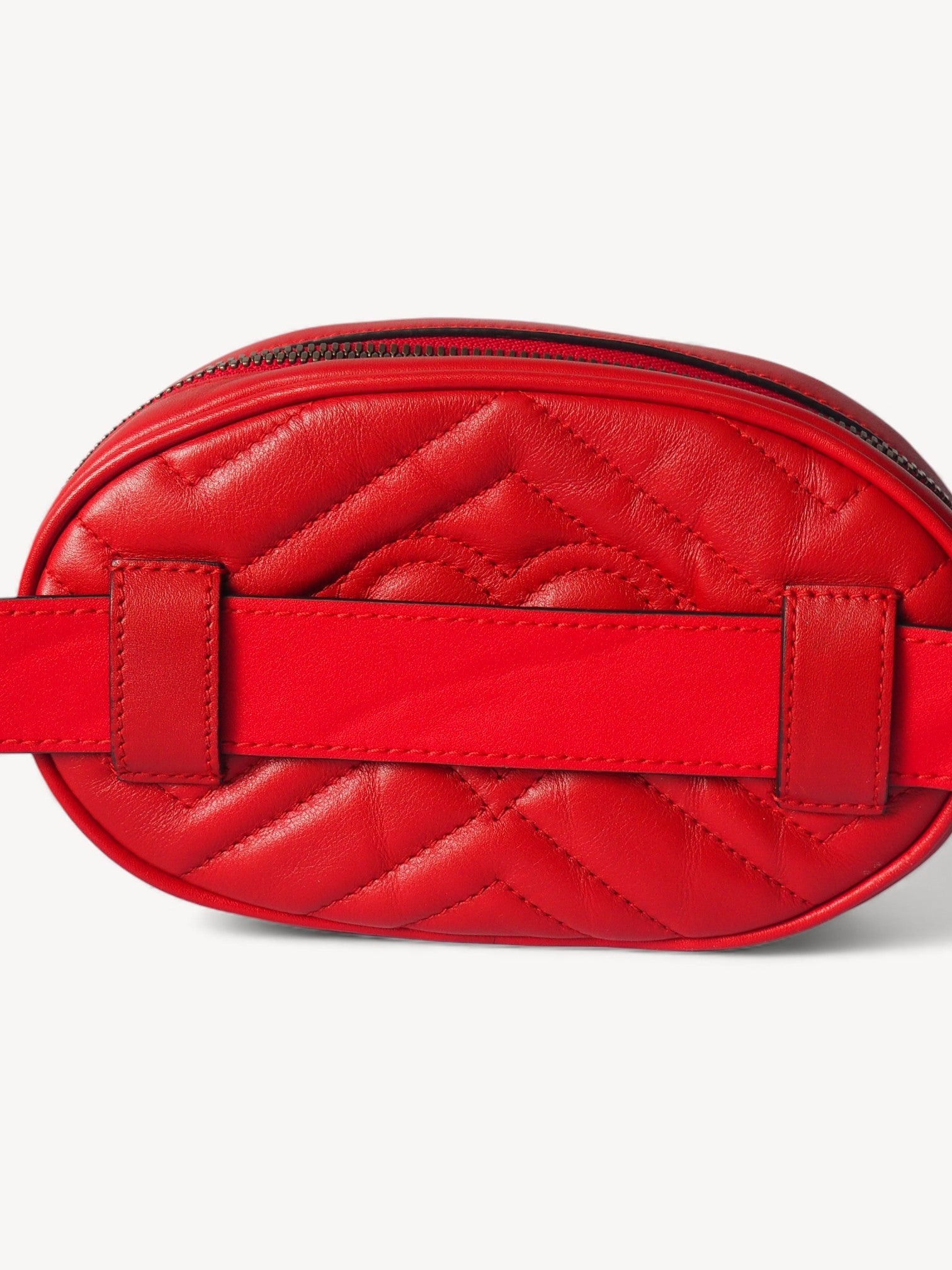 Gucci GG Marmont Belt Bag in red matelassé leather, featuring gold-tone hardware with a chic antique finish. The strap can be worn separately as a belt, while the bag can be carried as a clutch or toiletry pouch. Please refer to the images for a detailed view of the item.