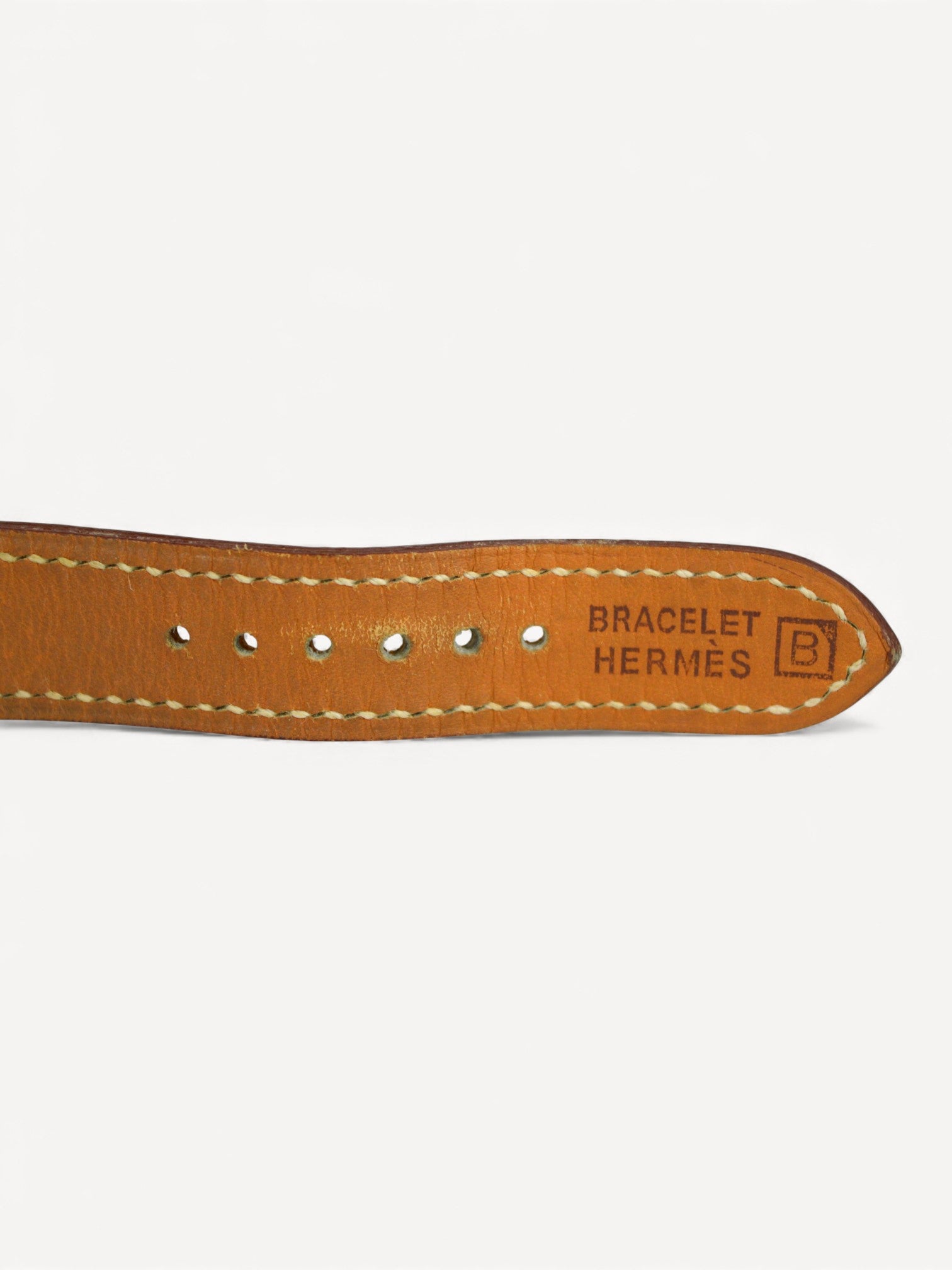 This Hermès Heure H Mini watch features a chestnut leather strap paired with a yellow gold-plated stainless steel case, showcasing the Maison’s iconic ‘H’ silhouette. A refined and timeless piece. Please refer to the images for a detailed view of the item.