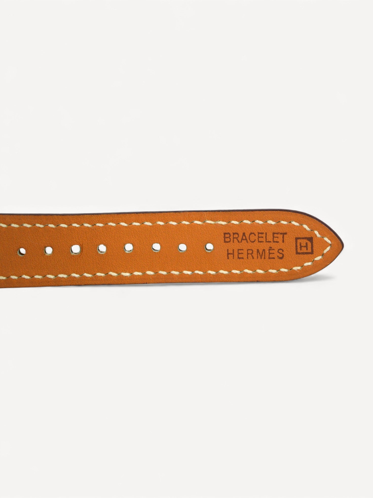 Hermès Heure H Mini watch featuring a brown leather adjustable bracelet and silver hardware. The signature 'H' case houses a white dial. Please refer to the images for a detailed view of the item.