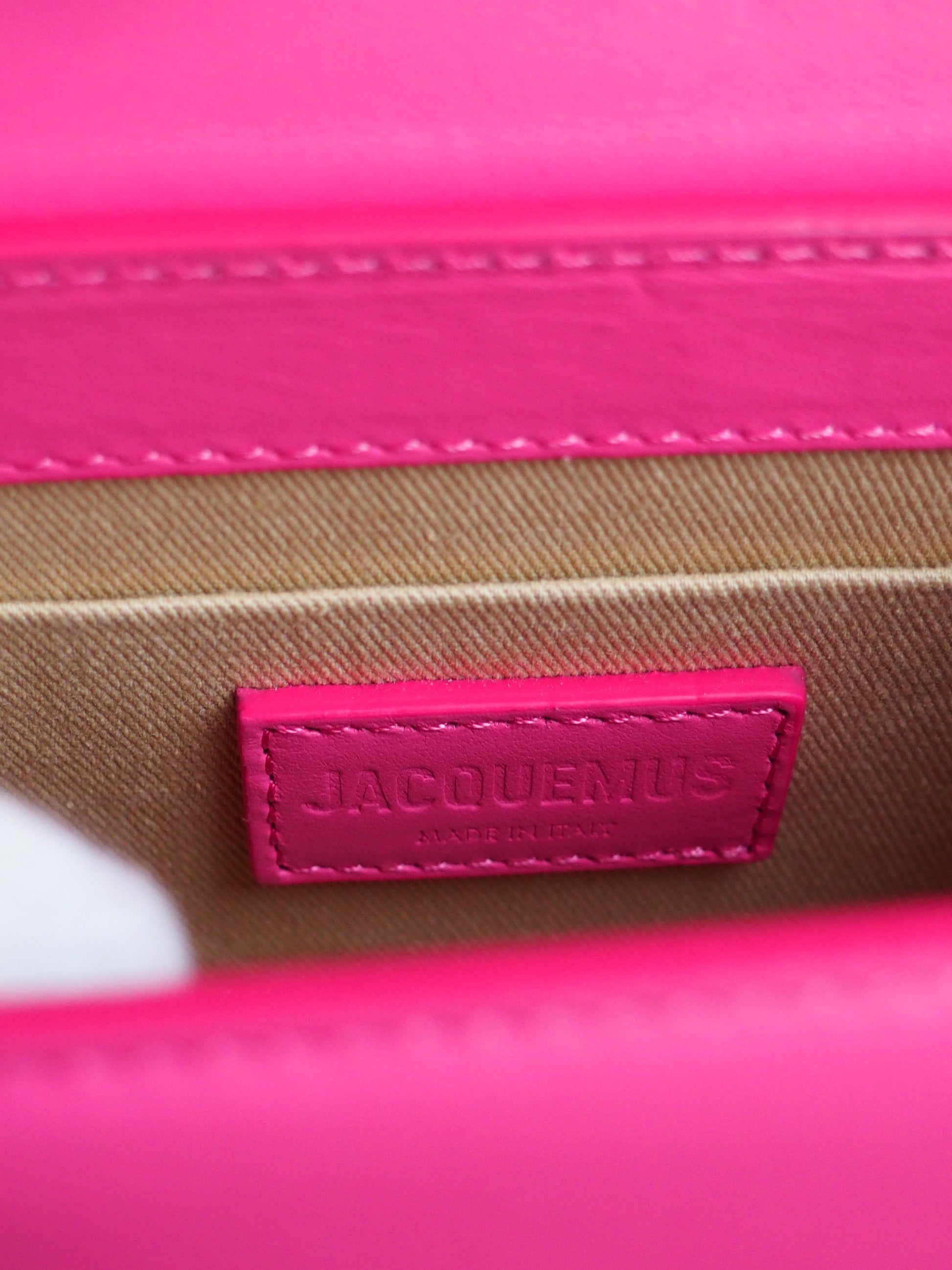 Jacquemus Le Chiquito bag in size medium. Crafted from pink calfskin leather and finished with gold-tone hardware. Comes with a shoulder strap that is both detachable and adjustable. Please refer to the photos for a detailed view of the item.