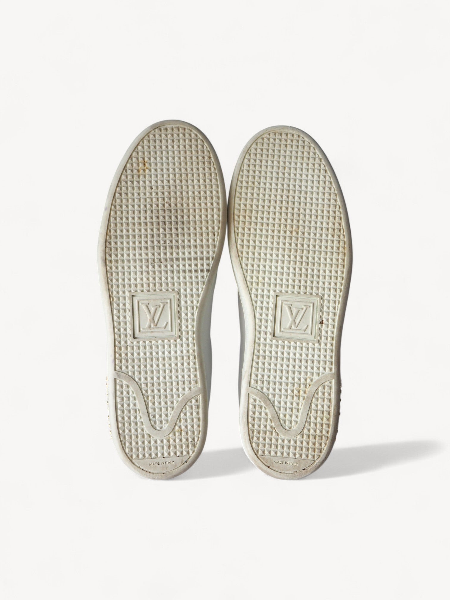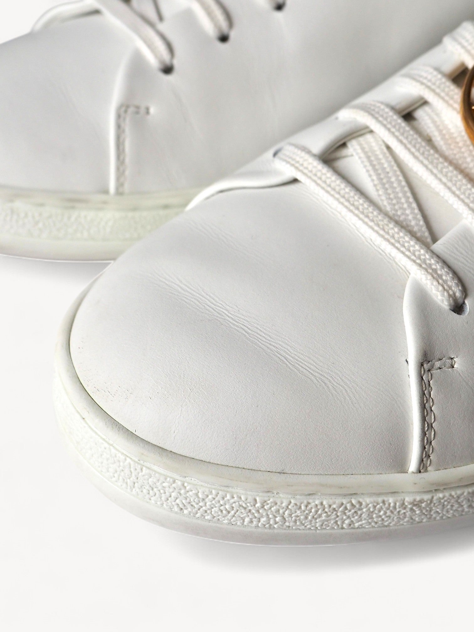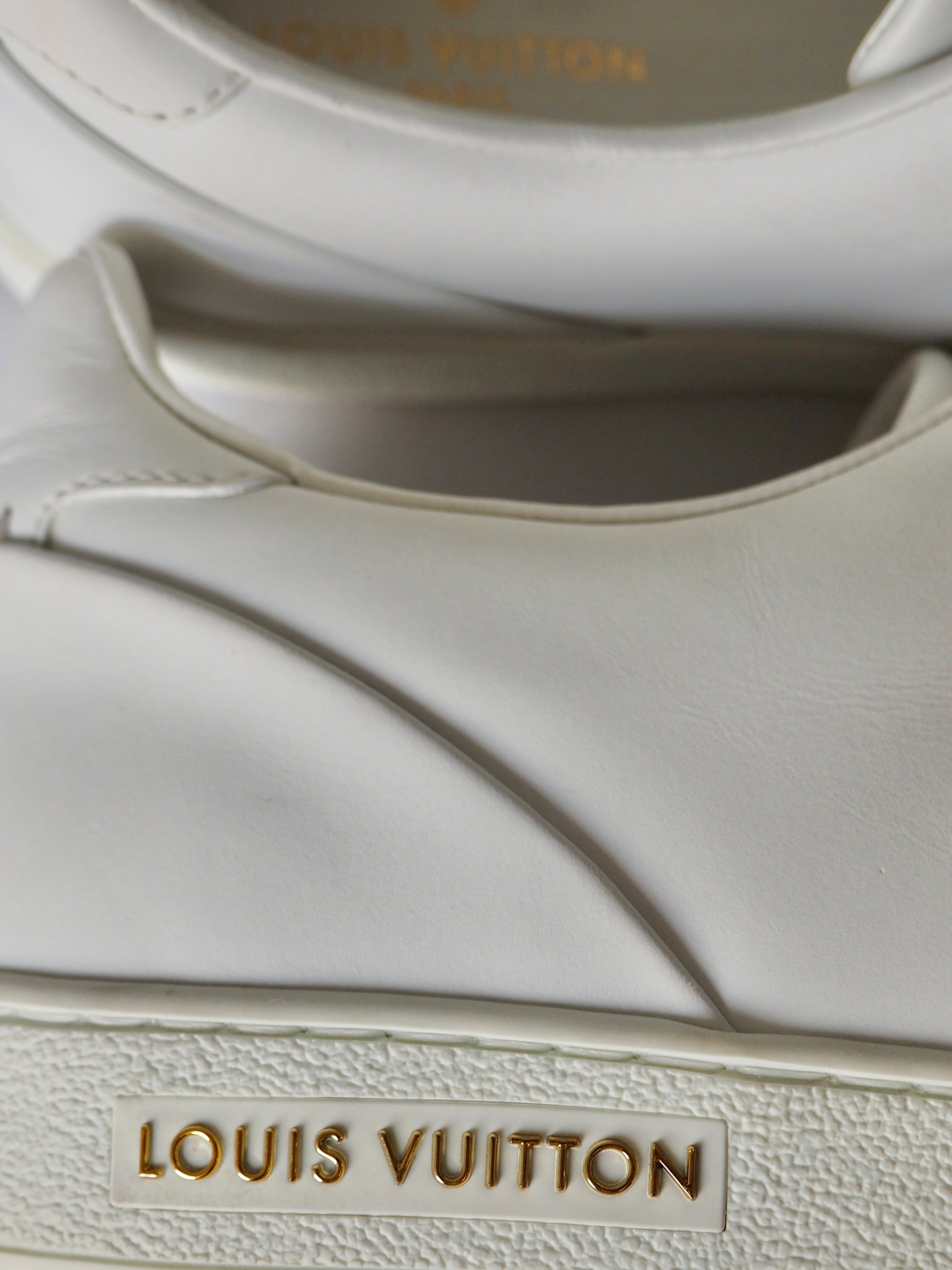 These white low-top LV Frontrow sneakers are crafted from smooth calfskin leather and designed with gold-tone LV initials on the laces, which are removable, and a gold “Louis Vuitton” logo on the side sole. Please refer to the images for a detailed view of the item.
