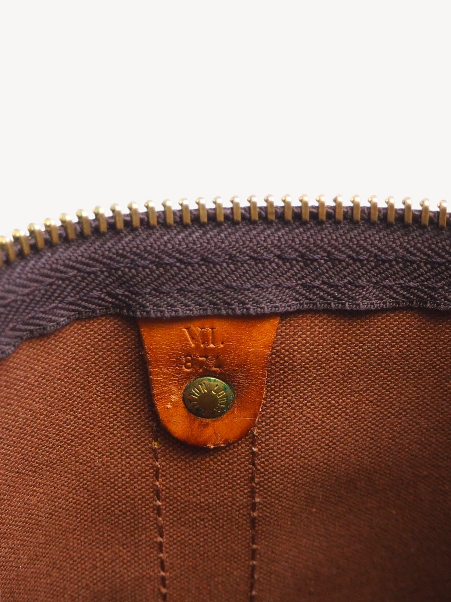 The Louis Vuitton Keepall 50 is a classic travel bag that's perfect for weekend getaways or short trips. The Vachetta leather has a beautiful honey color and shows slight signs of use. Dating back to 1987, it remains in very good condition for its age. Please refer to the images for a detailed view of the item.