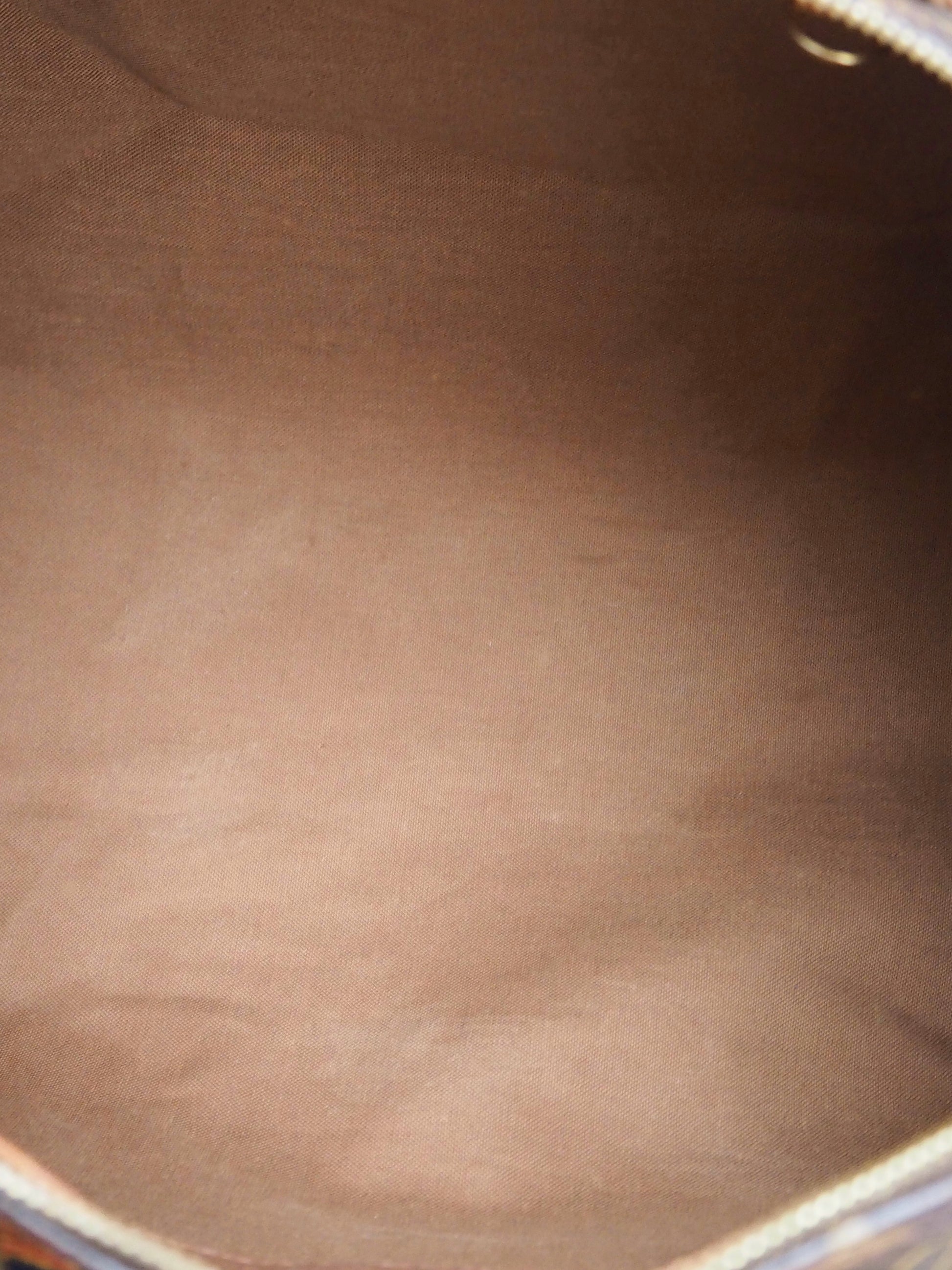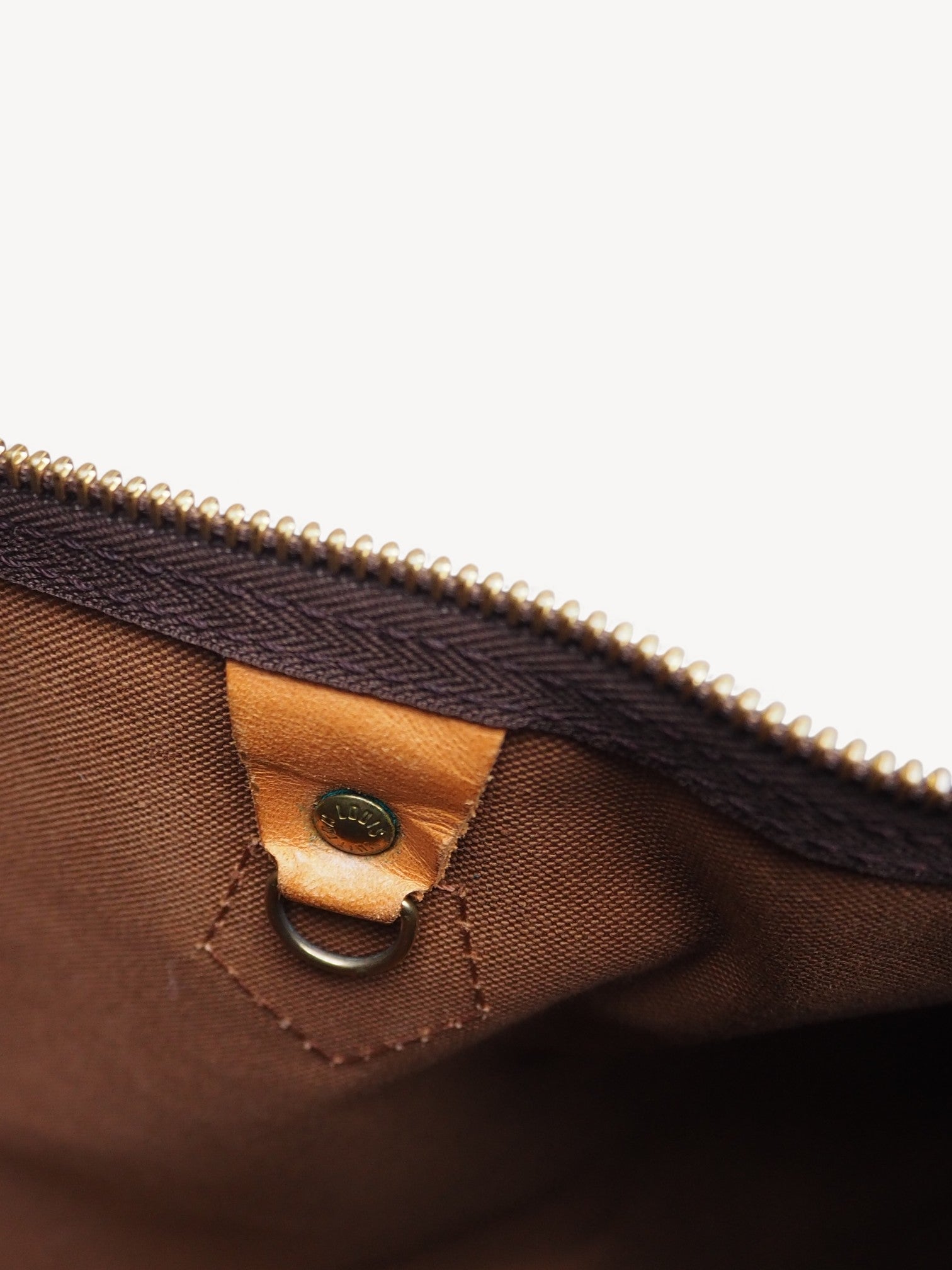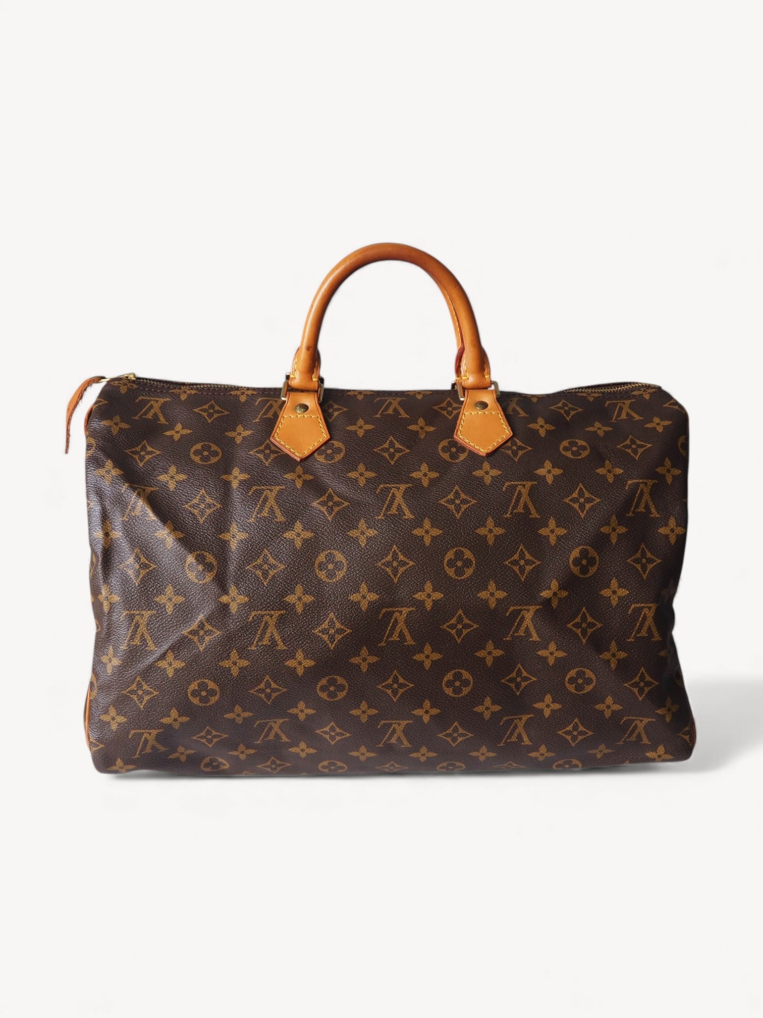 The classic LV Speedy is the ideal everyday bag thanks to its durability, timeless design and spacious interior (a laptop fits in the Speedy 40). The bag is crafted from monogram canvas and features natural cowhide leather handle and trim. Inside you'll find a hanging pocket and a key hook. The interior is clean. Please refer to the images for a detailed view of the item. TIP: To prevent damage to the leather zip pull, avoid pulling it directly when opening or closing the bag. Instead, use the metal part it’s attached to.