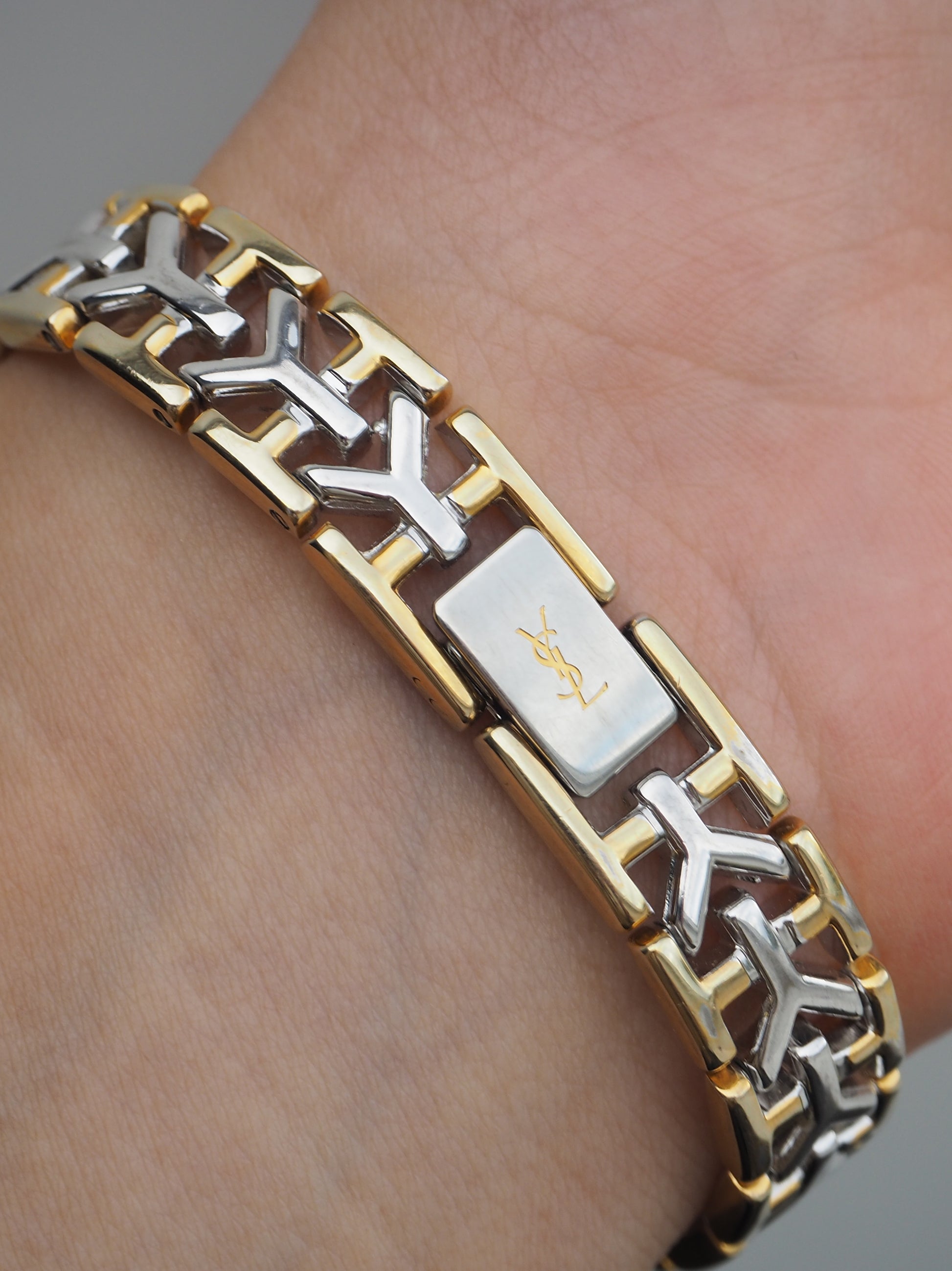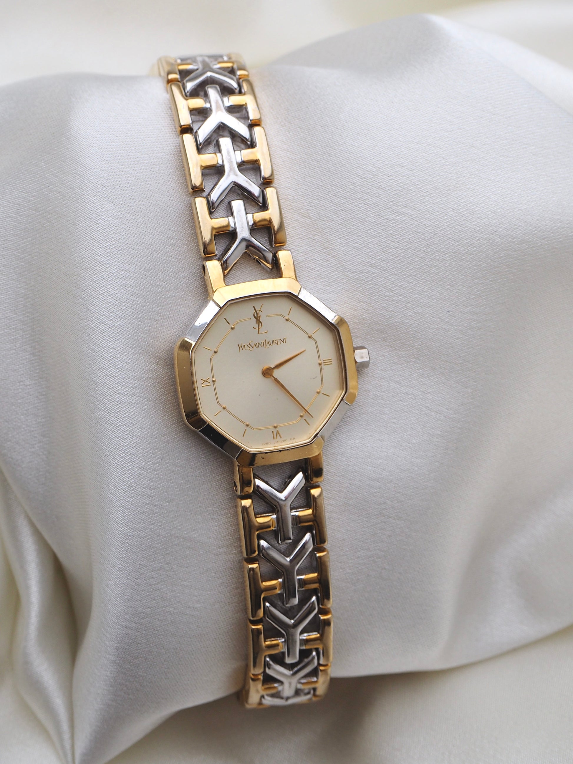 This timeless YSL watch is crafted from stainless steel and showcases a blend of gold and silver tones, iconic Y-logo links, and an octagonal dial with chic Roman numerals. The watch is in very good condition, with a few minor specks on the dial. Please refer to the images for a detailed view.