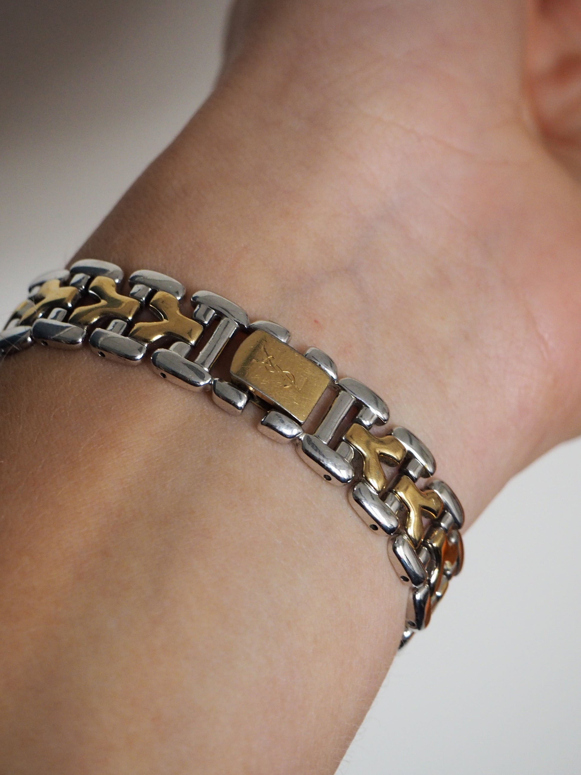 This timeless YSL watch features a blend of gold and silver tones, iconic Y-logo links, and round dial with a gold-tone bezel and gold-tone hands and hour markers. The bezel shows discoloration. Please refer to the images for a detailed view of the item.